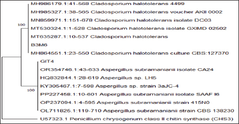 In antifungal testing, B3M6 showed weak activity against C. albicans with a zone of 5.13 mm (±0.25), and no detectable activity against T. harzianum (Fi. The extract from isolate B4T6 showed weak antibacterial activity against E. coli, with a clear zone of 1.13 mm (±0.87). It produced a zone of 9.35 mm (±0.04) categorized as moderate. In antifungal test B4T6 activity against C. albicans demonstrated activity with a clear zone of 5.68 mm (±0.25). Molecular identificationThe molecular identification of potential mollusc-associated fungal isolates G1T4 and B3M6 was conducted based on query coverage percentage identity. Phylogenetic analysis was performed using Penicilllium chrysogenum an outgroup, and the reconstructured phylogenetic tree is presented in Figure 5.
