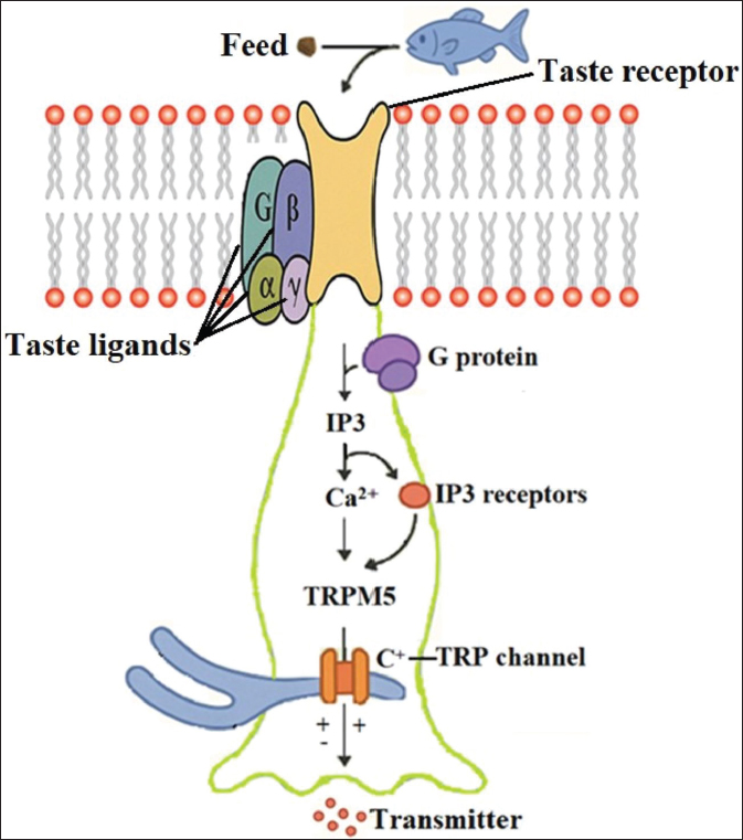 Fig. 1. Schematic representation of the taste transduction pathway in fish (adapted from Roper, 2014). Feed-derived taste ligands bind to membrane-bound taste receptors, activating associated G-protein subunits (G, α, β, γ). This triggers the production of inositol trisphosphate (IP3), leading to Ca2+ release via IP3 receptors. Elevated intracellular Ca2+ activates the TRPM5 channel, resulting in cation influx through the TRP channels and ultimately promoting the release of neurotransmitters to convey taste signals.