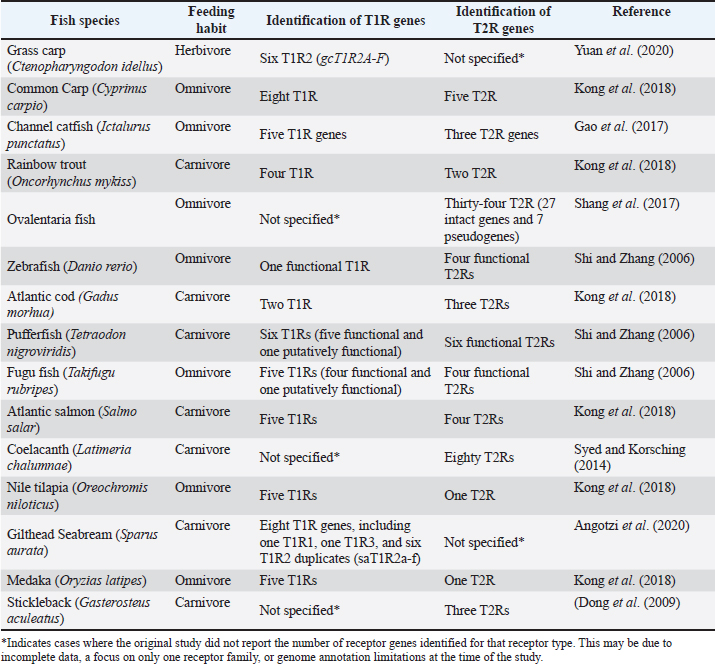 Table 1. A comparative overview of identified T1R and T2R taste receptor genes in diverse fish species, highlighting variation in gene number in relation to feeding habits, and referencing the original studies is presented.