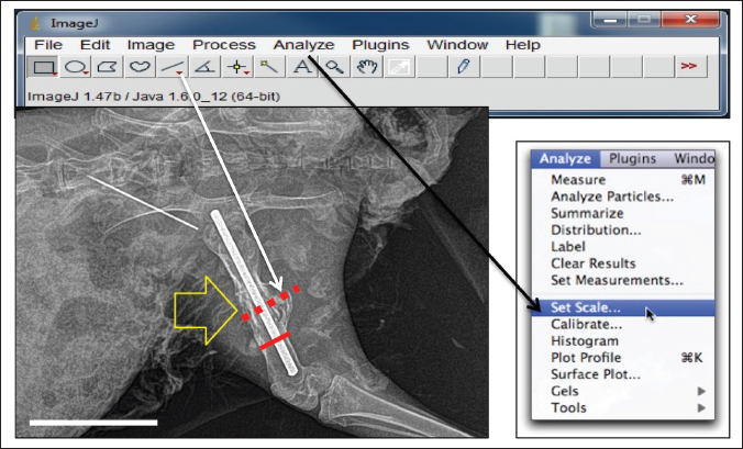 Fig. 2. Illustration of the steps required for the measurement of the callus size at the fractured site using ImageJ. After setting the scale, the straight selection tool was selected to drag a line over the bone and callus (solid red and dotted red lines, respectively). By selecting the measure tool from the Analyze tool bar, the lengths of the two lines were determined. Actual size of the callus=Diameter of the callus (at the fracture line) – Diameter of the normal bone. CT scan procedureThree rabbits from each group were euthanized on the 30th day post-operation. Then, the femur bone of the operated limb was carefully detached using a scalpel blade. The detached femurs were immersed in 10% formalin for approximately 24 hours and then transferred to the hospital for CT-scan imaging. The three femur bones of each group were arranged alongside each other within a CT scan tube, and the images were taken using an electron beam-type CT scan device (Optima company). Finally, the images were taken, and a three-dimensional format was used to assist in the observation of callus formation. Histological examinationThe femur bones were dissected from the surrounding soft tissue and fixed in 10% formalin for microscopic evaluation. Histological examination was carried out on samples of each group at 10th, 14th, 20th, and 30th post operation days for assessment of bone healing and consolidation. The samples were routinely prepared for Hematoxylin and Eosin stain (H&E). Statistical analysisGraphPad Prism (version 9.3.1) software was used for data presentation and statistical analysis. Normally distributed data (Shapiro-Wilk test) were analyzed by one-way or two-way analysis of variance (ANOVA) with Tukey’s post hoc test. Data failing the Shapiro–Wilk normality test were analyzed using Kruskal–Wallis one-way analysis of variance on ranks with a post hoc Tukey test. All results are presented as mean ± S.D, and p values of < 0.05 were considered statistically significant. Ethical approvalAll the procedures and approaches of this study were conducted and approved by the College of Veterinary Medicine Research Committee according to the principles of ethics. The data were collected and studied in accordance with other recorded retrospective clinical studies in agreement with an authorized institution. ResultsRadiological examinationObservation of radiographic assessment images at 10th, 20th, and 30th days post-operation has shown that the processes of bone healing and calluses formation were not indistinguishable between the groups, and various amounts of bone calluses were found at the fracture site. Although the calluses were less evident 10 days postoperatively, small areas of radiolucent or soft calluses were observed around the fractured lines, particularly in group B. The tissue around the fracture lines became hypertrophied and slightly radiopaque, possibly due to reorganization of the implanted bone graft. The fractured lines started to almost disappear at 20 days of the operation in the treatment groups, and the radiopacity and the number of calluses were greater than those in the control group. In addition, there was a complete formation of the hard callus around the fractured site at 30th day post the operation. However, the callus was completely radio-opaque and uniform in the treatment groups (A and B) compared with the control group. In the control group, the callus developed, but the amount and radio-opacity were lesser than in groups A and B, and the fractured line was still present. Nevertheless, the number of calluses apparently differed between groups A and B. In group B, the amount of callus and the degree of radio-opacity were slightly greater than in group A. To validate these differences, these specimens were scanned using a more precise machine (computed tomography) for complete clarification of the process of bone healing, as mentioned in the next section. ImageJ and statistical analysisAccording to our ImageJ criteria based on measuring the width and size of the calluses at the 10th, 20th, and 30th days of the operations on the radiographic images, it was found that the sizes of the calluses increased progressively in each group from 10th day to the 30th day after the operation. The average size of the callus was statistically analyzed using two-way ANOVA, with the p value < 0.05 considered statistically significant (Tables 1 and 2). Table 1. Sizes of the calluses (millimeters) in the control, PRP group) and Group B (PRP and Bone graft group) at 10th, 20th and 30th days post-operation on radiographic images using ImageJ.