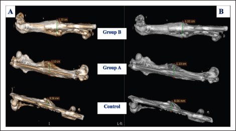 Fig. 3. Average size of calluses between the control and treatment groups (A and B) at 10th, 20th and 30th days post the operation. There were significant differences between them in which the smallest callus formation was obtained in the control group and the largest callus formation was obtained in groups A and B, using two-way RM ANOVA, Geisser-Greenhouse’s epsilon (p value < 0.05) (post-hoc Tukey test was used). Moreover, our results have clearly shown that the rate of callus formation was faster in group A than in the control group by about one-fold of the period. There were no significant differences between the callus size on the 20th day from group A (6.143 mm ± 0.351 SD) and those on 30th days in the control group (6.127 mm ± 0.211 SD). A similar situation was also observed in group B, where the callus size was larger in approximately one-fold of one period (10) days than in group A. The size of the callus in group B on the 20th day was 8.873 mm (±0.118 SD), whereas in group A and on the 30th day, it was approximately similar to that in group B on the 20th day postoperatively (8.667 mm ± 0.085 SD). Thus, in both groups, the rate of callus formation was faster than that in the control group. When groups A and B were combined, they showed much faster healing of the fractured bone than the control group and even than the individual application of these two materials (PRP and bone graft). Computed tomography (CT scan) examinationFor a complete examination of callus formation in all groups, three rabbits from each group were euthanized on the 30th day of the experiment. The CT scan images confirmed the radiographic findings. The calluses were completely developed at 30th day post the operation, but the number of calluses was greater in groups A and B than in the control group. The average widths of the calluses at 30th days post the operation in groups A, B, and the control group were 8.48, 11.09, and 7.37 mm, respectively. In groups A and B, the calluses were more uniform and extended toward the metaphysis of the bone, whereas in the control group, the callus was not uniform and did not extend toward the metaphysis of the bone as it appeared locally around the fractured line. Interestingly, the callus configuration also varied between the treatment groups. It was found that the callus is more uniform and thicker in about 20% of patients in group B (PRP and bone graft) than in group A (PRP) (Fig. 4). To confirm these data, the fractured bones were viewed using different reader’s methods, such as classic, Aligo, and thermo appearance (Fig. 5).