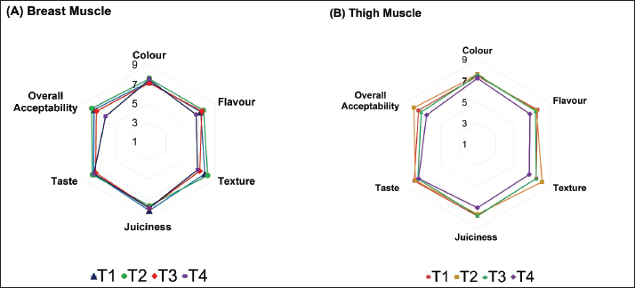 Fig. 2. Sensory evaluation Breast muscle (A) and Thigh muscle (B). The data represent the mean value of 10 samples per treatment; T1=Control, T2=10% of CRLM, T3=20% of CRLM, T4=30% of CRLM. DiscussionThe effects observed in this study were apparently created by differences in energy and CP levels as determined by inclusion levels of CRLM since the treatments were neither isocaloric nor isonitrogenous. It is noticeable that an increasing percentage of CRLM is linked to the slightly decreasing amount of ME. In line with the findings published by Melesse et al. (2018), the study’s results showed that CRLM has a comparatively high CP content (28.20%). (Ravindran et al., 1986) reported 20.1% of CP, which is slightly lower than found in the current study. Conversely, Régnier et al. (2013) reported higher CP levels ranging from 30.0 to 34.7%. The findings of this study aligned with Okpara et al. (2022) and Obakanurhe et al. (2025). The formulated feed’s protein composition was similar to that of the commercial diet, although it had a somewhat lower ME level than the formulated feed. Cassava leaf’s high protein content and its favorable 2:1 calcium-to-phosphorus ratio support proper skeletal development and overall growth in chickens. Therefore, it can serve as an effective alternative to conventional feed ingredients such as maize and soybean (David et al., 2023). Assessing an animal’s growth rate requires measuring metrics such as body weight, weight gain, FI, FCR, FER, and mortality. These measurements aided in determining the birds’ weight gain, feed consumption per day, and the efficiency with which feed was transformed into weight. The effect of CRLM treatments on broiler chicken growth can be ascertained by examining these measures. The average amount of feed consumed by animals is one of the most significant variables that affect their performance. According to the study, the addition of CRLM had a substantial impact on the chickens’ FI, which was higher than control at early starting phage but reduced in T3 (20% CRLM) and T4 (30% CRLM). Therefore, adding cassava leaf beyond that point may negatively impact FI and consequently lower the broiler chicken growth performance. This could be explained by the dustiness and disagreeable flavor of the cassava LM, which may have prevented the birds from eating enough. When feeds are permissible and coarser than when they are finely ground, birds have been observed to eat more (Melesse et al., 2018). However, FI value was higher in broilers reared in the T3 and T4 diets with a high level of CRLM inclusion. These findings are consistent with previous studies by Iheukwumere et al. (2008) that also observed enhanced FI in broilers fed with 20% and 30% CRLM. In addition, this current result agreed with Uchegbu et al. (2011) who concluded that CRLM can be successfully incorporated in broiler starter diets up to 30% dietary level considering FI. However, Ogbuewu and Mbajiorgu (2023) found that including low levels of cassava (4%–10%) in the chicken feed had positive effects on the growth variables of broiler chickens which is partially true with our study. On the other hand, this study is not consistent with the findings of Bakare et al. (2021), who observed no impact on chicken eating patterns when different levels of CRLM were included in their diets. The FCR was similar across all treatment diets except for T2, indicating that CRLM might be used to partially substitute maize and soybean in broiler rations. In the poultry industry, a lower FCR means that a flock of broilers is more efficient at converting feed into meat and require less feed to gain weight. This is important to the poultry industry as feed costs continue to drive up production costs. The amount of protein, fat, and water that accumulates in an animal’s body determines its weight gain. The physiological age and maturity stage of the birds are determined by the individual accumulation and proportion of these components in each bodily part. The performance of chickens fed T3 and T4 diets was poorer than those given lower CRLM levels, aligning with the findings of Melesse et al. (2018) who reported reduced growth in birds fed higher CRLM inclusions. The weight gain may be attributed to anti nutritional factors in CRLM. Other harmful substances, such as protease inhibitors, HCN, tannins, non-starch polysaccharides, and phenols can also reduce FI (Elnour et al., 2020). Besides deficiency of certain amino acids particularly those sulfur-containing amino acids in CRLM may affect the lower body weight gain with a higher percentage of CRLM (Rahman et al., 2015). In broiler chicken production, achieving a lower FER is highly desirable. A lower FER means that broiler chickens are able to convert feed into body mass more effectively. This results in faster growth and quicker attainment of market weight. In our study, birds fed with a diet containing 30% CRLM exhibited a significantly lower FER compared to other groups, aligning with the results reported by Sabuj et al. (2019). The birds on the T2 (10% CRLM) treatment showed superior values in the weight of the cut parts of the carcass. The depressed weights of the carcass cut parts may be as a result of low FI in higher percentage of CRLM (Okpanachi et al., 2014); the inability of the birds to convert the feed into meat (Nwoche et al., 2006). The study by Bakare et al. (2021a,b) also revealed that broilers fed cassava-based diets attained marketable weights and produced satisfactory dressed carcass weights and dressing percentages without adverse effects. This suggests that cassava meals can be incorporated into broiler diets at levels up to 20% without negatively impacting performance or economic returns. Hematological qualities are strongly influenced by nutrition, and the values of these traits show the animals’ nutritional state and how responsive they are to their surroundings, including feed and feeding. In this study, the 