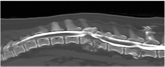 Fig. 1. Computed tomography reconstructed sagittal image of the thoracic and lumbar spine illustrating lysis on the caudal endplate of L2 and cranial endplate of L3, with irregular and poorly defined margins; an irregular periosteal reaction of the lateral aspects of the vertebral bodies and vertebral arch, and a pathologic fracture of the caudal metaphysis of L2 causing subluxation. These bony changes are associated with isoattenuating material along the ventral and ventrolateral aspect of the vertebral canal over the vertebral bodies of L2 and L3, causing ventral extradural spinal cord compression. Similar but less severe lesions were found affecting L5–L6 with minimal ventral compression of the spinal cord. The subluxacion was reduced manually and stabilized using a bilateral and biplanar ESSF. A total of six 2.5mm positive-partially-threaded pins, eight Meynard clamps and three connecting rods were implanted. The positive-partially-threaded pins were inserted in the vertebral bodies of L1 and L4, avoiding contact with the affected vertebrae. Immediate post-operative radiographs were obtained confirming reduced subluxation and realigned vertebrae (Fig. 3). In-house cytology of impression smears made of the material collected showed structures compatible with fungal hyphae amongst neutrophils and fibroblasts (Fig. 4). Postoperatively, clindamicin (15 mg/kg q12h IV), enrofloxacin (5 mg/kg q12h IV), ampicilin (22 mg/kg q12h IV), meloxicam (0.1 mg/kg q24h SC), and fluconazol (5 mg/kg q12h PO) were administered while culture results were pending. The right corneal ulcer was treated with topical antibiotics and artificial tears. Histopathology results showed multiple areas of granulomatous-necrotizing swelling and the presence of fungal structures with hyphae characteristics after Grocott’s stain. Five days after the surgery the dog was discharged with slightly decreased muscle tone of the pelvic limbs, but intact nociception and tail movements.