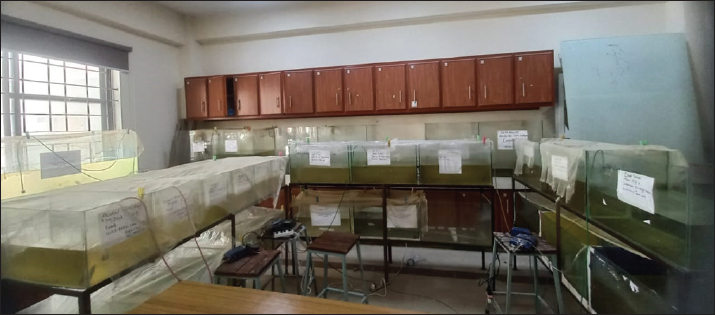 Fig. 1. The aquarium setup used for the experimental trial. Digestibility trial and apparent digestibility coefficients (ADC) determinationsThe digestibility trial was conducted just after the 60-day feeding trial with the same groups of fish. This timing was selected to allow sufficient time for the fish’s intestinal physiology and microbial community to adapt to the experimental diets. Considering the influence of dietary transition on nutrient utilization, conducting the digestibility trial at this stage minimized dietary transition variability and will give a more accurate estimate of nutrient use from test diets. A total of (n=20) fish from each trial with similar body weight were selected and transferred to two aquariums (122 × 45.7 × 55.8 cm, 284 l water) and fed the experimental diets based on the same ration level given in the growth trial. The digestibility trial was continued for 21 days. The daily provided feed was recorded, and uneaten feed was collected 20 minutes after feeding to avoid contamination of feces with uneaten feed. Only the uneaten feed was siphoned, collected on pre-weighed filter paper, dried, and reweighed to calculate the actual feed intake. This procedure ensured that only the consumed feed was used in the growth and digestibility calculations. Feces were gently siphoned from the aquarium onto a 150-mm screen, rinsed with distilled water to remove residual salts, and stored at −20°C for further analysis (Ward et al., 2003). Feces were sampled by gentle siphoning from each tank after a 24-hour feeding period to reduce contamination with uneaten feed. Siphoning may cause leaching of soluble nutrients, such as amino acids, into the water. To reduce this concern, feces were collected as soon as they were defecated, and the tanks were closely monitored during collection sessions. The water quality in each aquarium was maintained by replacing the water once every 2 days before the first feeding. The water quality parameters, including temperature, pH, dissolved oxygen, and ammonia-N, were checked on a daily basis. Fecal samples were ground with a mechanical mortar and pestle and sieved using a 1 mm screen for further analysis. The energy of the sample was determined using an adiabatic bomb calorimeter (Philipson Micro-bomb calorimeter: Gentry Instruments, Aiken, SC, USA) following the standard procedures (AOAC, 2019). As chitin is an indigestible component of insect meal, it was not included in the protein, lipid, and energy digestibility calculations. After removing chitin, the nutrient dietary composition of the diets was used to calculate the digestibility coefficients for protein, lipid, and energy. The ADCs of protein, lipid, and gross energy were calculated following the method of Luo et al. (2006). Body compositionFive fish of the same size were sampled from each experimental aquarium. Sampling was performed on the last day of the experiment after 24 hours of feed withdrawal to reduce the interference of gut content in subsequent analyses. Fishes were oven-dried at 70°C and ground to a powder, which was then analyzed for proximate composition. The proximate analysis of fishes in terms of moisture, total ash, crude fat, and CP was performed to evaluate the nutritive value of fishes according to AOAC (2019). Moisture was determined by oven drying at 105°C for 18 hours, and CP was determined by micro-Kjeldhal analysis. Crude fat content was determined according to a standard protocol (Luo et al., 2006). Mineral compositionFish samples (10 g) were ashed at 550°C for 6 hours in a muffle furnace. The ashed sample was diluted in 5 ml of 10% HCl. This was filtered and made up to the mark in 50 analysis flask, and the filtrate was used for the analysis. The mineral composition of the fish was analyzed according to the methods of AOAC (2019). Statistical analysisThe obtained data were subjected to one-way ANOVA, and Tukey’s honesty significant difference test was applied to compare differences among means. The level of significance was chosen at p < 0.05 using CoStat (version 6.303) (Steel et al., 1996). Ethical approvalNot needed for this study. ResultsGrowth performanceThe growth performance of L. rohita was tested in two diet groups that contained different proportions of BSF and MW larvae meal replacing fishmeal. The findings indicated that the most significant growth performance was in the 75% BSF and 50% MW diet groups. Growth performance was measured using the following parameters: weight gain (WG), feed conversion ratio (FCR), and specific growth rate (SGR). Initially, L. rohita fingerlings had an average initial weight of 5.56 ± 0.04 g across all treatment groups. The 75% BSF-based diet led to the highest WG, SGR, and FCR of 14.53 ± 0.43 g, 1.837 ± 0.038, and 1.313 ± 0.071, respectively (Fig. 2). Similarly, the data showed that the 50% MW-based diet group had the best growth performance. The maximum WG and better SGR and FCR were recorded in the 50% MW based diet group as 15.56 ± 0.41 g, 1.763 ± 0.029, and 1.140 ± 0.070, respectively (Fig. 3).