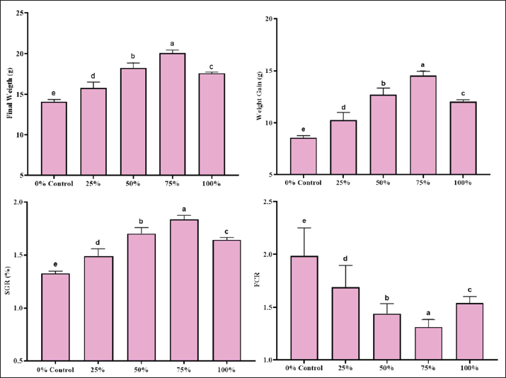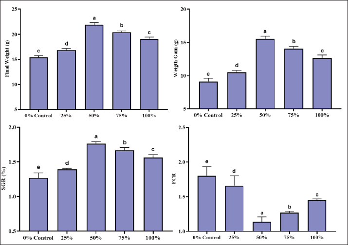 Fig. 2. Growth performance of L. rohita fed on different levels of BSF-based diet.