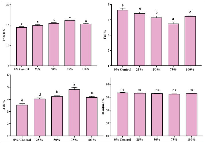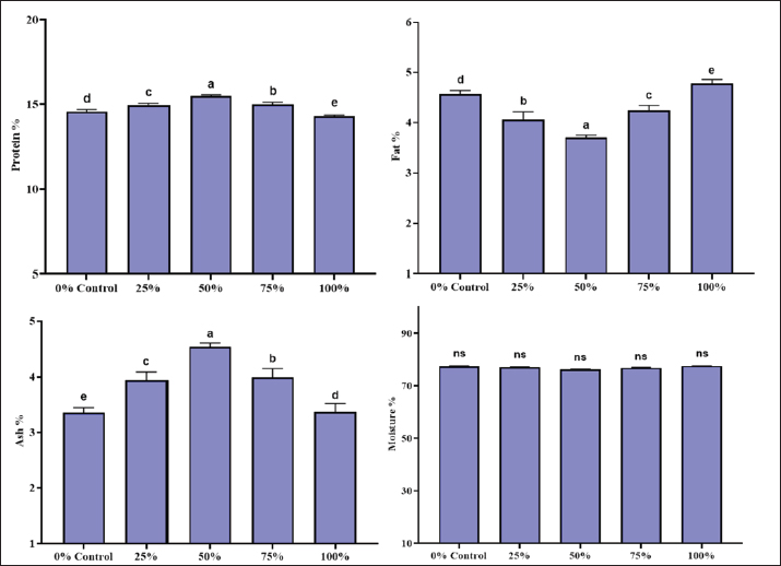 Fig. 4. Body composition of L. rohita fed with different BSF-based diet levels.