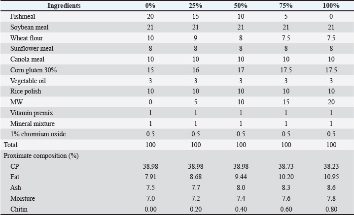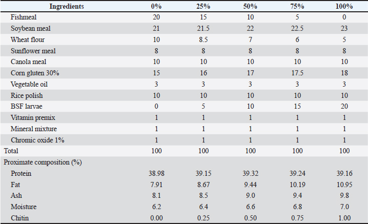Growth trialTwo trials were carried out separately, with 15 aquaria used for each trial. Both trials were simultaneously conducted under the same environmental conditions in the same facility to make them comparable. All aquaria were kept under the same water quality management regime, photoperiod, and feeding schedule to reduce possible tank effects. After the acclimatization period, 10 uniform-sized fish (initial mean weight, 5.56 ± 0.04 g) in good health condition were stocked in each of the 15 aquaria. Each aquarium had a capacity of approximately 311 l with dimensions of 122 × 45.7 × 55.8 cm. Three replicate tanks were used to perform the experiment (n=3 tanks, 10 fish per tank), and each dietary treatment was carried out in three tanks. In the first trial, five diets were prepared by replacing fish meal with BSF larvae meal as follows: 0%, 25%, 50%, 75%, and 100%. In the second trial, five diets were prepared by replacing fish meal with MW larvae meal. Each experiment trial was performed in triplicates for 60 days under a completely randomized design (Fig. 1). The fish were fed two equal portions per day at 0800 and 1,400 hours for 60 days. The experimental trial was conducted at ambient temperature and subjected to a natural photoperiod of approximately 12 hours light/12 hours dark period. Approximately 50% of the water in each aquarium was changed daily with freshwater dechlorinated to provide optimum environmental conditions. The water quality parameters were checked every 3 days according to the standard protocol. At the end of the experiment, all fish from the aquariums were counted and collected for further processing.