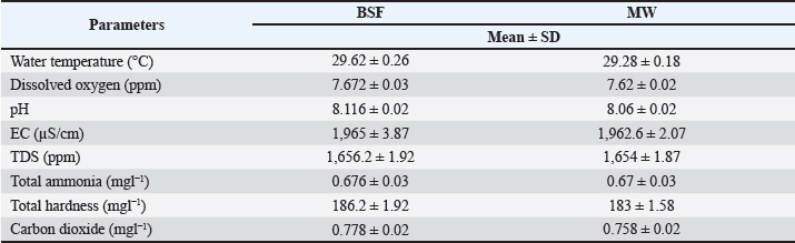 Fig. 3. Growth performance of L. rohita fed on different MW-based diet levels. Parameters of water qualityWater quality is a critical parameter in aquaculture as it has an impact on fish health and performance. Water quality parameters, such as temperature, dissolved oxygen, pH, electric conductivity (EC), total dissolved solids (TDSs), total ammonia, total hardness, and carbon dioxide, were measured on a fortnightly basis throughout the experiment. The results reveal that the water quality parameters fell within the optimal range of growth of L. rohita in the three treatment groups, and no significant differences were observed between the BSF and MW diets. The mean water temperature was 29.62°C ± 0.26°C and 29.28°C ± 0.18°C in the BSF and MW diet groups, respectively. These parameters were within the acceptable range for L. rohita growth. The dissolved oxygen levels were slightly higher in the BSF group (7.672 ± 0.03 ppm) than in the MW group (7.62 ± 0.02 ppm). The pH levels were nearly the same in both diet groups, as 8.116 ± 0.02 and 8.06 ± 0.02 in the BSF and MW diet groups, respectively. The electrical conductivity values were nearly the same in both the BSF and MW groups at 1965 ± 3.87 and 1962.6 ± 2.07 µS/cm, respectively. The TDS values were 1,656.2 ± 1.92 and 1,654 ± 1.87 ppm in the BSF and MW diet groups, respectively. The recorded total ammonia and hardness values were within the optimum range, ensuring that no toxic effect of ammonia and water hardness was applied to fish health (Table 3). Table 3. Water quality parameters during the experimental period.