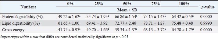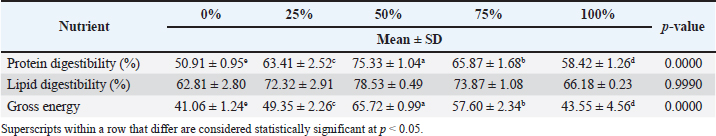 Nutrient digestibilityNutrient digestibility was measured in terms of protein, fat, and energy. Significant differences in protein and gross energy digestibility were observed among the different diet groups. The results indicated a marked improvement in nutrient digestibility in the BSF and MW meal groups, especially in the BSF 75% and MW 50% groups (Tables 4 and 5). Table 4. Obvious nutrient digestibility (protein, lipid, and gross energy) of L. rohita fingerlings fed with diets containing varying amounts of BSF meal.