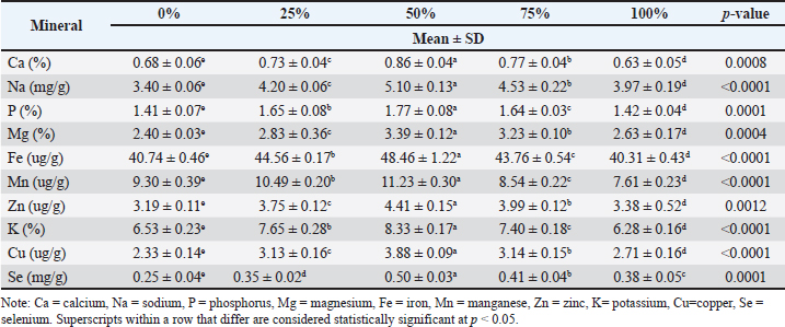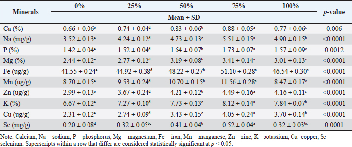 Table 7. Mineral composition of L. rohita fingerling fed with varying levels of MW diet.