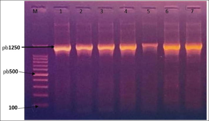 Fig. 1. 16SrRNA gene (15,00 bp) amplified PCR products: Agarose gel electrophoresis, 1.5% agarose, ethidium bromide staining, and 1.30 hours of electrophoresis at 5 volt/cm2.