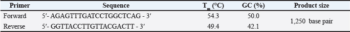 25 µl of PCR amplification mixture containing (5 µl) Taq PCR premix, (1 µl) forward primer, (1 µl) reverse primer, (1.5 µl) DNA, and (16.5 µl) distilled water. 5 minutes for initial denaturation at 94°C was the PCR condition protocol. Denaturation-2 94°C for 45 seconds, annealing 56°C for 45 seconds, extention-1 72°C for 45 seconds, and extention-2 72°C for 7 minutes. The 16S rRNA gene was amplified using the PCR technique to confirm the identification of bacterial species level, and the positive result was detected by 1.5% agarose gel electrophoresis, as shown in (Figs. 1-3).