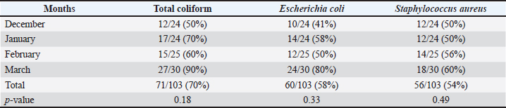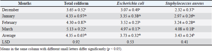 There were significant differences (p < 0.05) in the total coliform in the minced meat according to the months (Table 3). The total coliform was less in December and January than in February and March. The values of total coliform in minced meat in December and January were 3.65 and 4.33 CFU log10/g, respectively, while the highest value was in March at 5.13 CFU log10/g. Table 3. Total coliforms, E. coli, and S. aureus counts (mean ± SE) (CFU log10/g) in the minced meat samples collected from different regions of Al-Najaf according to the months.