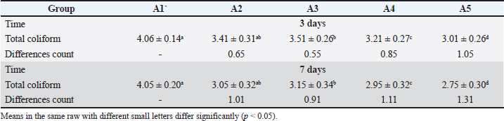 Escherichia coli counts with a mean value in the minced meat were 3.07 and 3.35 CFU log10/g in December and January, respectively, which were less than in March, which was higher significantly (p < 0.05) at 4.97 CFU log10/g (Table 3). The minced meat was significantly more contaminated during March than other months (p < 0.05). There were significant differences between the values of staphylococcus counts according to month (Table 3). The minced meat was significantly (p < 0.05) more contaminated in March (4.08 CFU log10/g) than in other months, while the lowest value was in December (2.32 CFU log10/g). The average value was 3.43 CFU log10/g. Table 4 shows the decontamination effect of EOs (rosemary and thyme) and lactic acid on the inhibition of coliform. The current study found that lactic acid and the EO of rosemary and thyme affected coliform levels, but the combination of EO (A5) showed a static effect (p < 0.05) after 3 and 7 days. Table 4. Total coliform (Log10 CFU/g) decontamination results.