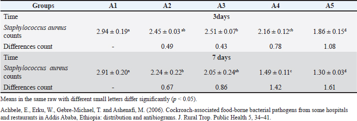 The change of S. aureus counts after using lactic acid and EO is shown in Table 6: All groups significantly exceeded the control group in reducing S. aureus after 3 and 7 days (p < 0.05). The greatest decrease in S. aureus counts was in the combination of rosemary and thyme EO (group A5) after 7 days (1.61 Log10 CFU/g) statistically (p < 0.05). Table 6. Staphylococcus aureus (Log10 CFU/g) decontamination results.
