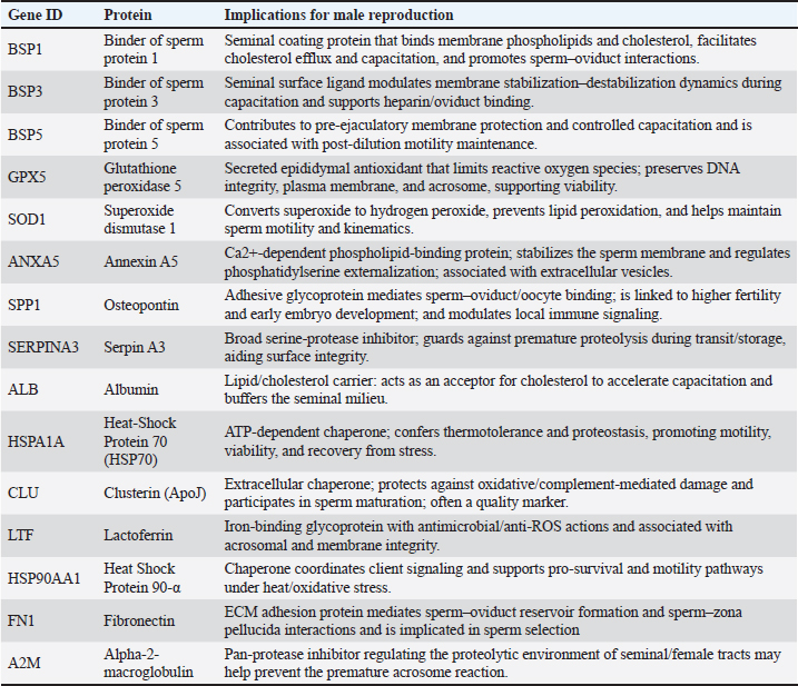 The tropical context helps explain the prominence of stress-buffering proteins. The consistent detection of HSPA1A, HSP90AA1, CLU, GPX5, and SOD1 under tropical heat conditions demonstrates molecular protection against persistent oxidative and thermal challenges typical of humid climates. These proteins collectively help preserve sperm motility, sperm viability, anti-stress mechanisms, membrane stability, and acrosomal competence despite heat stress in the environment. Chronic exposure to elevated temperature–humidity indices likely induces continuous cellular heat-shock responses, which stimulate the upregulation of these protective proteins to maintain sperm function and structural integrity under tropical heat stress. Simultaneously, BSP family members, together with ANXA5, ALB, SPP1, and FN1, facilitate capacitation and adhesion within the female tract—processes essential for maintaining fertility under tropical heat exposure (Diansyah et al., 2023a; Diansyah et al., 2025a). These results have clear implications for fertility management under tropical conditions from an applied perspective. Functional implications of seminal-plasma protein in Saanen bucks presented in Table 4. The conserved extracellular and vesicle-oriented core provides a molecular baseline for monitoring semen quality and selecting donors in tropical herds. The few variable proteins suggest candidate markers, such as SPP1, FN1, BSPs, HSP70, HSP90, CLU, GPX5, SOD1, and LTF, that could serve as a simple proteomic checklist alongside routine semen testing. Implementing such protein-informed screening may enhance sire selection accuracy, optimize semen preservation strategies, and improve fertility performance in heat-stressed environments. Such a panel could help flag ejaculates with stronger integrity and adhesion capacity and may inform cooling strategies and extender formulation during semen handling (Diansyah et al., 2023b; Diansyah et al., 2025a). Table 4. Functional implications of seminal-plasma protein in Saanen bucks.