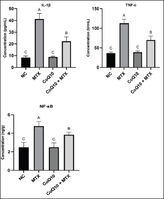 Fig. 5. Levels of IL-1β, TNF-α, NF-κB, and NO in the different experimental groups. Data are shown as mean (columns) ± SD (error bars) for six rats per group. Distinct uppercase letters indicate statistically significant differences at p < 0.05. DiscussionAlthough MTX is a commonly used anticancer and immunosuppressive compound, nephrotoxicity limits its clinical applications (Koźmiński et al., 2020), especially at higher doses, primarily due to OS-mediated inflammation and apoptosis (Alum et al., 2023). In this study, MTX administration caused renal injury, demonstrated by increased serum creatinine, BUN, uric acid, and urinary NAG levels, decreased antioxidants (GSH, SOD, and TAC), increased lipid peroxidation (increased MDA), and activation of inflammatory mediators (increased IL-1β, TNF-α, and NF-κB). These changes were responsible for MTX-induced nephrotoxicity. MTX-induced renal toxicity is primarily associated with OS, starting with ROS generation upon its metabolism, followed by mitochondrial dysfunction (Heidari et al., 2018). In this study, MTX induced OS by elevating MDA and TOS levels, while remarkably suppressing major renal antioxidants, including GSH, SOD, and TAC. This outcome aligns with previous studies reporting an association between ROS generation and the depletion of the body’s antioxidant systems with MTX-induced toxicity (Dar et al., 2021; Ezhilarasan, 2021). Oxidative damage dysregulates cellular macromolecules, amplifies inflammation, and triggers apoptosis (Roghani et al., 2020), leading to renal injury. Coadministration of CoQ10 demonstrated significant renoprotective effects by restoring antioxidant systems, as evidenced by higher GSH, SOD, and TAC concentrations in renal tissues compared with the MTX-only group. GSH is the most abundant non-enzymatic antioxidant, essential for ROS detoxification and redox homeostasis (Abdulrahman et al., 2024). The 57% reduction in GSH in the positive control group demonstrates severe depletion of the cellular antioxidant pool. Similarly, SOD depletion indicates an impaired enzymatic defense against superoxide radicals, thereby accelerating mitochondrial damage and lipid peroxidation (Anwar et al., 2025). Elevated MDA levels further confirm extensive membrane damage, as MDA is a definitive marker of lipid peroxidation (Yekti et al., 2018). Increased TOS in the positive control group indicates a cumulative increase in total oxidant load, reflecting intensified OS on renal tissues (Palm and Nordquist, 2011). Although complete restoration of the antioxidant systems did not occur, these findings demonstrated the antioxidant potential of CoQ10. This outcome is consistent with the well-documented free radical-scavenging ability of CoQ10 (Cirilli et al., 2021). The reduction in MDA concentrations due to CoQ10 pretreatment further supports its role in preventing lipid peroxidation and membrane damage. The alterations observed in BUN, creatinine, uric acid, and urinary NAG provide important insight into the extent and nature of renal involvement in this model. Elevated BUN and creatinine levels reflect reduced glomerular filtration and early functional impairment, which commonly accompany drug-induced nephrotoxicity (Wu and Huang, 2018; Sharma and Singh, 2023). Changes in UA levels indicate disturbances in tubular handling and oxidative metabolism (Gherghina et al., 2022); UA often rises secondary to OS, impaired tubular secretion, or increased cellular turnover (El Ridi and Tallima, 2017). Urinary NAG is the most sensitive marker of proximal tubular injury (Spasovski, 2013). This lysosomal enzyme is released into urine following subclinical or early tubular damage (Novak et al., 2023), which often precedes measurable changes in serum creatinine. Therefore, the concurrent rise in these biomarkers shows both functional (glomerular) and structural (tubular) injury. Their improvement with treatment indicates a genuine renoprotective effect, likely mediated through OS and inflammation attenuation. A deeper analysis of these biomarkers strengthens the mechanistic interpretation of the findings and aligns with previous studies demonstrating the utility of BUN, creatinine, UA, and NAG as early and reliable indicators of renal toxicity and therapeutic response. CoQ10 significantly attenuated MTX-induced biochemical and histopathological alterations. However, it did not fully restore all parameters to baseline levels due to the multifactorial nature of the induced injury, in which OS is only one component of the overall pathological process (Kala and Howard, 2025). CoQ10 is mainly an antioxidant and mitochondrial stabilizer. However, the underlying pathway of MTX-induced nephrotoxicity involves additional mechanisms, including inflammatory signaling, membrane lipid peroxidation, impaired protein synthesis, and metabolic enzyme disruption (Algendy et al., 2023). CoQ10 alone may not fully correct these mechanisms. In addition to OS, inflammation plays a crucial role in MTX-induced nephrotoxicity. Significant increases in IL-1β, TNF-α, and NF-κB levels, which are key inflammation mediators, were observed in the PC group. These results are consistent with previous reports of the inflammatory-activating and renal-damaging effects of MTX (Dar et al., 2021). CoQ10 coadministration markedly reduced these inflammatory mediators, demonstrating its ability to suppress NF-κB signaling and the inflammatory cascade. However, the effect of CoQ10 is more suppressive than curative because it failed to restore inflammatory cytokine levels to baseline normal levels, as in the NC group. Excessive NO generation contributes to OS by forming peroxynitrite, a highly reactive oxidant (Piacenza et al., 2022). In this study, NO levels were also elevated in the PC group, indicating potential endothelial dysfunction and glomerular injury. CoQ10 reduced renal NO concentrations remarkably, further exhibiting its potential to modulate redox-sensitive pathways