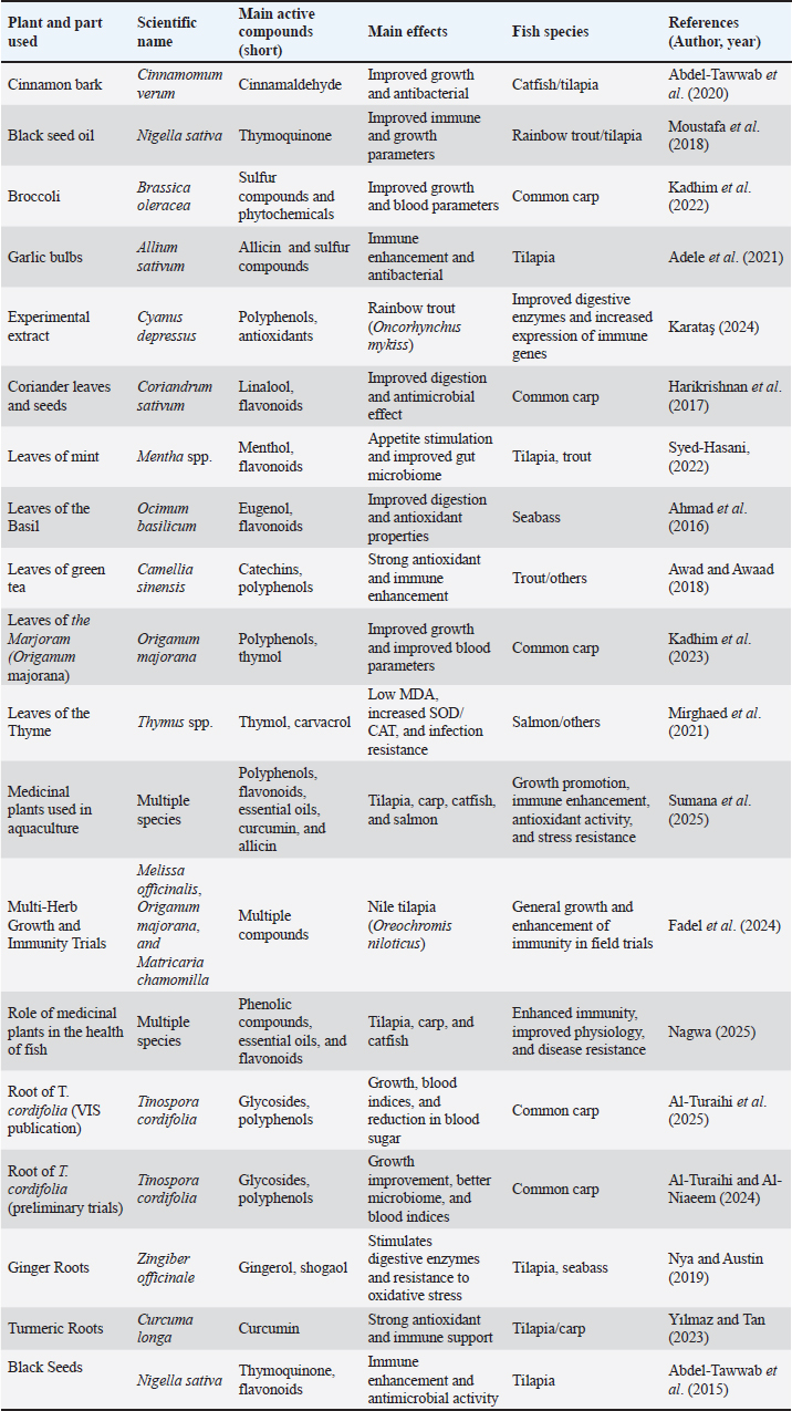 On the environmental and economic levels, the use of these naturally additives enhances environmental sustainability and reduces chemical pollution in the aquatic environment, as well as reducing production costs associated with the use of antibiotics and traditional treatments. On the other hand, the field faces challenges such as the lack of long-term studies and variations in experimental design, which requires a standard, research protocols, and unified evaluation criteria (Tadese, 2021). ConclusionRecent research highlights the effectiveness of medicinal plants and plant extracts as natural solutions for boosting immunity and growth in fish. These additives help reduce antibiotic dependence while supporting aquaculture’s environmental and economic sustainability. Their Benefits paid primarily by mechanisms such as improving gut microbiome health, stimulating non-specific immunity, and enhancing antioxidant activity. However, despite the significant benefits of medicinal plants and extracts, there is a need to standardize experiments and analyze long-term safety and establish regulation standards to ensure the quality of products and their sustainable application in aquacultures. These studies confirm the need for long-term research to assess the safety and effectiveness of medicinal plants and concentrated extracts across different fish species. These investigations are crucial for achieving the intended benefits while minimizing the potential risks. This study further advocates for the development of a clear protocol to identify optimal dosages and suitable application methods tailored to specific plants and fish species, building on the experimental designs outlined in earlier studies. Moreover, it promotes the integration of medicinal plants with advanced biotechnology, such as probiotics and artificial intelligence, to enhance the monitoring of nutritional and immune health and ensure safer and more efficient applications. The study also underlines the importance of training and awareness programs for farmers and aquaculture workers, enabling them to adopt best practices and avoid the indiscriminate use of plant-based additives. Finally, it calls for ongoing environmental evaluation to analyze the effect of plant extracts on aquatic ecosystems, especially when applied on a commercial scale, to safeguard the sustainability of the environment and maintain safe fish production. AcknowledgmentsWe acknowledge the help and support provided by the Faculty of Agriculture, University of Basrah, for conducting this research work. Conflict of interestThe authors have no conflicts of interest to declare. FundingNo grant was received for this study, and it has been self-funded. Authors’ contributionsDr. Khalidah S. Al-Niaeem was the corresponding author of this article. Kadhim H. Al-Kanani, Amjed K. Resen, Qusai S. Jumma and Ali A. Abd was responsible for study observations and research management. These authors contributed equally contributed equally to this work. Data availabilityAll data are provided in the revised manuscript. ReferencesAbdel-Tawwab, M., Adeshina, I., Jenyo-Oni, A., Ajani, E.K. and Emikpe, B.O. 2017. Growth, physiological, antioxidants, and immune response of African catfish (Clarias gariepinus B.) fed diets supplemented with turmeric (Curcuma longa) powder. Aquacult. Repor. 6, 64–70. Abdel-Tawwab, M., Khalil, R.H. and Metwally, A.A. 2020. Dietary cinnamon (Cinnamomum verum) improves growth and disease resistance in African catfish. Aquacult. Res. 51(3), 1005–1016. Abdel-Tawwab, M., Khattab, Y.A.E., Ahmad, M.H. and Shalaby, A.M. 2015. Effect of dietary black cumin seeds (Nigella sativa) on growth performance, feed utilization, and health status of Nile tilapia Oreochromis niloticus. Aquacult. Res. 46(2), 292–303. Abubakar, A.R. and Haque, M. 2020. Preparation of Medicinal Plants: basic Extraction and Fractionation Procedures for Experimental Purposes. J. Pharm. Bioal. Sci. 12(1), 1–10. Abu-Zahra, S., Ali, I., Abou, Z. and Mayada, A. 2025. The role of medicinal plants in aquaculture: enhancing fish health, physiology, and resistance to infections Nagwa, I. 25–37. Adel, M., Safari, R., Pourgholam, R., Zorriehzahra, J. and Esteban, M. 2015. Dietary peppermint (Mentha piperita) extracts promote growth performance and increase the main humoral immune parameters (both at mucosal and systemic level) of Caspian brown trout (Salmo trutta caspius Kessler, 1877). Fish Shellfish Immune 47(1), 623–629. Ahmad, M.H., Abdel-Tawwab, M. and Khattab, Y.A.E. 2016. Effect of basil (Ocimum basilicum) on growth performance, feed utilization, and health status of European sea bass. Aquacult. Nutrit. 22(4), 837–845. Ahmed Et Al., A.R. 2023. The effect of Shilajit on growth performance, blood parameters, and key liver enzymes of the common carp (Cyprinus carpio). Egypt. J. Aquat. Biol. Fish. 27(4), 683–693. Al-Shammari, S. 2025. The resistance of aeromonas bacteria to antibiotics and the effectiveness of lactic acid bacteria against pathogenic strains in Cyprinus carpio L. Egyptian J. Aquat. Biol. Fish. 29(1), 747–758. Al Shammari Et Al., N.A.H. 2023. Molecular identification of some zoonotic bacteria isolated from fishes Cyprinus carpio L. and Oreochromis niloticus (L.). Egypt. J. Aquat. Biol. Fish. 27(4), 1047–1062. Alberts, A., Al-Tamimi, A. and Hassan, M. 2024. Nigella sativa: therapeutic review with emphasis on thymoquinone in aquaculture. Internat. J. Mol. Scie. 25(24), 13410. Al-Hasson, H.A.H., Al-Niaeem, K.S. and Elbour, M. 2025. Effects of dietary pumpkin seed flour (Cucurbita pepo) supplementation on growth, physiological condition, and resistance to pathogens challenge in Cyprinus carpio. Open Vet. J. 15(9), 4418–4431. Al-turaihi Et Al., Z.M.R. 2023. Effect of dietary Tinospora cordifolia supplementation on growth performance and hemato-biochemical parameters of the common carp (Cyprinus carpio). Egypt. J. Aquat. Biol. Fish. 27(5), 677–688. Al-Turaihi, S. and