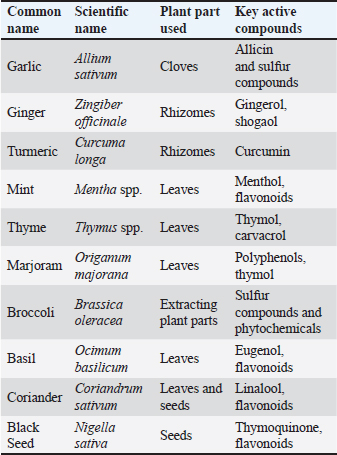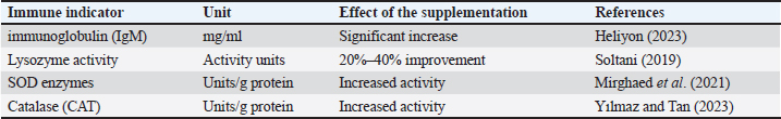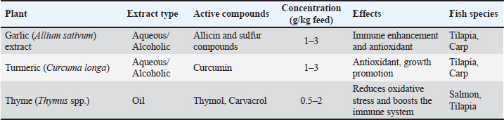 Studies have indicated that garlic extract contributes to immune system strength and growth promotion by improving gut microbiome health and physiological function (Valenzuela-Gutiérrez, 2021; Al-Hasson et al., 2025). Turmeric (Curcuma longa) and its active component curcumin have also drawn attention since 2017. Abdel-Tawwab et al. (2017) reported that curcumin supplementation at doses of 200–400 mg/kg was able to significantly enhance non-specific immunity and resistance to infection caused by Aeromonas hydrophila. Additional evidence corroborates the potent antioxidant effect of curcumin, reduction of oxidative stress, and ability to boost Nile tilapia production (Mahmoud et al., 2017; Al-Niaeem et al., 2025). Recent research has highlighted the potential of curcumin in red tilapia diet, improving growth, blood parameters, and liver function, thereby positioning it as a promising natural alternative to chemical stimulants (Radwan, 2024). Aromatic herbs such as thyme (Thymus spp.) have also been shown to be effective in fish health management. Active compounds such as carvacrol and thymol demonstrate improvement in immune response and reduction in oxidative stress when used in freshwater species such as trout and tilapia between 2018 and 2022. Low doses ranging from 0.5 to 2 g/kg were consistent in delivering stable results (Hafsan, 2022). Additionally, peppermint (Mentha spp.) has proven effective in enhancing appetite and stabilizing the intestinal microbiome, with recent findings highlighting improved growth rates and disease resistance following supplementation over a period of 30–45 days (Zahran, 2020). Studies on basil (Ocimum basilicum) emphasize its versatility in aquaculture applications. Eugenol-rich extract from basil has been shown to improve growth and immunity in trout, besides serving as a naturally sedative during fish transport, a beneficial trait for farm operations (Noorbakhsh, 2024). Similarly, coriander (Coriandrum sativum), known for its linalool content, has a notable advantage in enhancing the immune system and reducing bacterial infection in tilapia through dietary supplementation (Das et al., 2023; Said, 2023). Several studies (2019–2024) have shown that black seed (Nigella sativa) and its thymoquinone compounds play a prominent role in increasing immunity efficiency and reducing inflammation, while improving growth rates in different fish species (Alberts et al., 2024). Based on the above, the period between 2015 and 2025 witnessed an accumulation of knowledge about the importance of medicinal plants in aquaculture, with most studies agreeing that the optimal dosage ranges from 0.5 to 3 g/kg feed for 30–60 days. However, some variability in the results was due to differences in preparation and extraction methods, the fish species studied, and rearing conditions. Therefore, further long-term studies are needed to accurately determine the optimal dosages, standard preparation protocols, and chemical characteristics of extracts, especially in commercial production settings. In general, studies have concluded that whole medicinal plants and concentrated extracts have multifaceted positive effects on fish, including immunity, gut health, and growth. However, appropriate dosages must be selected to avoid toxic effects at higher concentrations. The results of recent studies also indicate that medicinal plants and extracts provide an effective and sustainable biological solution to improve fish health in aquaculture systems, as they combat pathogens, enhance innate immunity, improve digestion, reduce the need for antibiotics, and limit their associated health and environmental risks (Zahran, 2020; Tadese et al., 2021; Valenzuela-Gutiérrez, 2021; Yılmaz and Tan, 2023; Kadhim et al., 2023; Al-Turaihi and Al-Niaeem, 2024; Alberts et al., 2024; Radwan, 2024; Sumana et al., 2025; Abu-Zahra et al., 2025). However, there are clear differences in efficacy depending on the plant type, supplement form (whole plant or extract), concentration used, and target fish species. Concentrated extracts, such as curcumin and garlic, typically exhibit stronger immune-boosting effects, but they require careful dosage adjustment to avoid toxicity or side effects (Yılmaz and Tan, 2023). Factors affecting the use of plants and plant extracts as fish immunostimulantsRecent evidence indicates that the effectiveness of medicinal plants and plant extracts as nutritional and immunological additives in aquaculture largely depends on the plant variety, the plant type, the parts used, such as leaves, roots, or seeds, and the extraction method. These factors affect the concentration of active compounds and, consequently, the plant’s biological efficacy (Tables 4–8) (Dadras et al., 2023; Yılmaz and Tan, 2023). Determining the optimal dosage is essential for achieving the desired benefits, as excessive doses, especially when using concentrated extracts, can lead to toxic effects in fish (Chahardehi et al., 2020; Yılmaz and Tan, 2023; Grădinariu et al., 2025). Among the most prominent active compounds that play a pivotal role in stimulating the immune response and improving growth and disease resistance are allicin in garlic, curcumin in turmeric, and phenols and volatile oils in thyme (Tadese et al., 2021). These plants play an important role in improving the intestinal microbiome of fish by enhancing digestion efficiency, nutrient absorption, and overall digestive health (Syed Hasani, 2022). Plant extracts play a vital role in enhancing the non-specific immune response of fish by stimulating certain degradative enzymes, such as lysozyme, and boosting antioxidant molecules such as superoxide dismutase (SOD) and catalase (CAT). In addition, studies have shown that these extracts provide antioxidant effects that reduce the accumulation of free radicals and oxidative stress, thus supporting fish growth and improving their ability to cope with environmental and infection stresses. From an