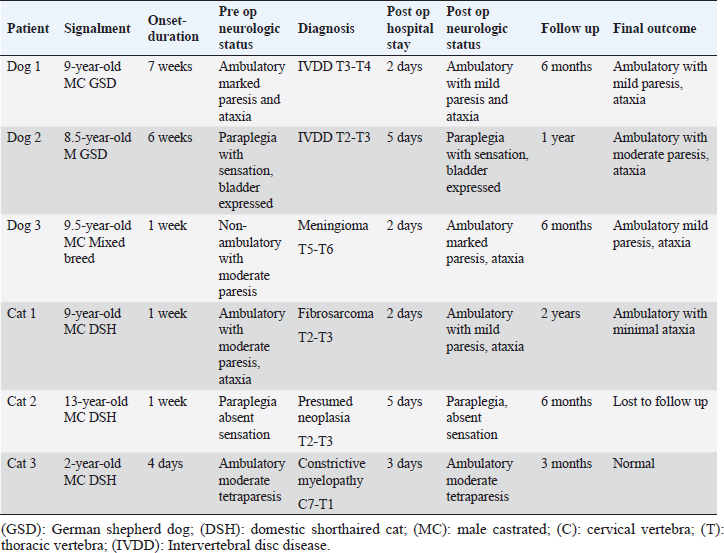 AbstractBackground: The optimal surgical approach to relieve spinal cord compression in the cranial thoracic spine is not well described, and the anatomy of the cranial thoracic vertebrae creates added surgical difficulty. Aim: This study describes the surgical approach, treatment, and outcome of three dogs and three cats that underwent a cranial thoracic hemilaminectomy for the treatment of extradural spinal cord compression. Surgical positioning was tailored to avoid extensive dissection and provide for a restricted, careful approach. Methods: Three dogs and three cats presenting for cranial thoracic spinal cord compression requiring surgical intervention were included. Results: All patients were discharged within 5 days. No patients experienced postoperative deterioration in neurologic status, and four animals had improved neurologic status at discharge. Conclusion: In cases with cranial thoracic spinal cord compression, the spinous processes can be spared, extensive muscle dissection minimized, and successful outcomes achieved with the appropriate positioning and limited approach. Keywords: Hemilaminectomy, Intervertebral Disc Disease, Myelopathy, Thoracic. IntroductionCranial thoracic compressive spinal lesions are uncommonly reported in veterinary medicine, with the majority of information on intervertebral disc disease in dogs. These cases typically present with clinical signs of T3-L3 myelopathy (trouble walking or moving the hind limbs). Diagnosis of spinal cord disease can sometimes be made with radiographs, myelography, or computed tomography (CT); however, the gold standard for evaluation of the spinal cord is MRI. The recommended treatment for spinal cord compression, especially causing severe or chronic neurologic signs, is the surgical removal of compressive material. This is accomplished by removing part of the vertebra (laminectomy or hemilaminectomy) to access the spinal canal. However, how to best perform cranial thoracic (T1–T9) spinal surgery is also uncommonly described in veterinary medicine, existing primarily as case reports and small case series (Gilmore, 1983; Liptak et al., 1999; Jäderlund et al., 2002; Gaitero and Añor, 2009; Gaitero et al., 2011). Anatomy of the cranial thoracic spine presents challenges in determining the best surgical approach to address spinal cord disease, since movement around this region is limited by the large muscle mass around the vertebrae (Hansen, 1952; Jeffery, 1995; Wilkens et al., 1996) and the thoracic limbs, scapulae, and musculature interfere with surgical visualization. The optimal surgical intervention for cranial thoracic spinal cord compression remains unclear. A variety of surgical procedures have been reported in the cranial thoracic spine, including a ventral procedure with surgical division of the sternum (Hearon et al., 2014), partial lateral vertebral body removal (Bottcher et al., 2008), or by removing various portions of the vertebral lamina—described as dorsal, hemidorsal, or modified dorsolateral laminectomies (Parker, 1973; Reidarson et al., 1988; Liptak et al., 1999; Jäderlund et al., 2002; Sumner and Simpson, 2007; Gaitero and Añor, 2009; Hearon et al., 2014). Complications included pneumothorax, rib luxation, subluxation of the spinal column, and immediate post-operative deterioration (Wilkens et al., 1996; Bottcher et al., 2008; Gaitero and Añor, 2009; Hearon et al., 2014). These previously reported surgical techniques have been associated with difficulty positioning the patient for surgery, limited visualization of the surgical site, the need to remove a large amount of thoracic epaxial muscle, and possible spinal destabilization following such as removal of muscle, ligaments (especially the dorsal tendinous raphe and dorsal interspinous ligament), and part of the vertebra, sternum, or ribs. These factors often lead to an increased risk of surgical complications and a slower recovery of neurologic status. The authors perform a hemilaminectomy in the cranial thoracic spine for ventral or lateralizing compressive lesions, with surgical positioning specifically tailored to maximize visualization and avoid removal of adjacent ribs or scapula. Materials and MethodsThree dogs and three cats were included in the study, based on clinical signs of neurologic deficits in the hind limbs, consistent with T3-L3 myelopathy (Table 1). MRI (1.5T Symphony, Siemens Healthcare) was used to confirm the diagnosis and site of spinal cord compression. Sagittal and transverse planes of the thoracic spine, including T2-weighted and T1-weighted pre- and post-contrast (Gadoversetamide, Mallinckrodt Incorporated) administration were acquired. Results of MRI were consistent with spinal cord compression in the cranial thoracic spine in all cases (Fig. 1). Two dogs had severe ventral and lateral spinal cord compression from suspected intervertebral disc protrusion while the third dog had moderate lateral spinal cord compression from an extradural meningioma. All cats also had severe spinal cord compression, with MRI identifying a contrast-enhancing mass, diffuse infiltrative process, and spinal canal stenosis. All animals were placed in sternal recumbency with the torso elevated above a standard operating table such that the thoracic limbs could be easily placed in an orthostatic position (Fig. 2A). The thoracic limbs were not secured to the surgical table, with the exception of one cat. Elevation was achieved in cats with additional padded material and vacuum-bags, supporting the thorax and abdomen, allowing the thoracic limbs to approach the operating table (Fig. 2B). Dogs were positioned in a trough padded with vacuum-bags, elevated at the cranial end allowing the thoracic limbs to hang just in front of the trough (Fig. 3). The troughs were secured both to the operating table and to the animal with surgical tape. In this manner, the scapulae were naturally lowered and abducted from the thoracic spine. Table 1. Summary of ca