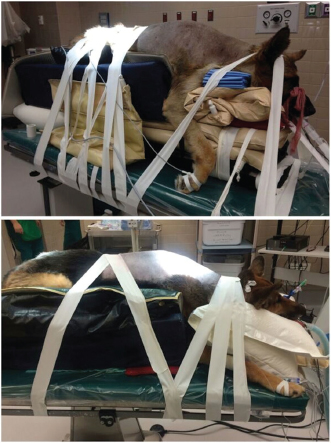 Fig. 3. Surgical positioning of two different canine patients with torsos elevated for thoracic limb arrangement.