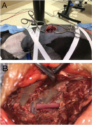 Fig. 5. View of a cadaver dog showing minimal muscle dissection with exposure of spinous processes (A) as well as completed hemilaminectomy (B). The six animals included in this study were client-owned patients of a tertiary specialty referral hospital, not experimental subjects. As such, an IACUC protocol was not necessary; however, the appropriate standard of care for intra-operative and post-operative analgesia was adhered to with a stringent emphasis on patient comfort. Results and DiscussionIn the cases of this series, the surgical positioning allowed for a restricted, careful approach without the need for additional incision of the dorsal interspinous ligament or tendinous raphe, retraction of the scapula, or luxation/resection of rib heads. Despite a limited muscular dissection, the approach still provided excellent visualization of the dorsal, lateral, and ventral vertebral canal. By beginning the hemilaminectomy with a pilot hole, spinal cord orientation was easily assessed to guide further drilling. No intraoperative complications were experienced (i.e., pneumothorax).