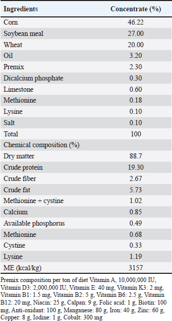AbstractBackground: The demand for sustainable, natural feed additives in the poultry industry is gradually increasing to make production more efficient and increase the quality of the products, especially in spent laying hens. Aim: This study examined the benefits of dietary dried lemon citrus peel (DLCP) supplementation on egg performance and egg quality in aged laying hens at the end of their production life. Methods: Eighty Lohmann hens at 64 weeks postmolt age and 2700 ± 75 g average body weight were randomly divided into four dietary treatment groups: basal diet (control, T1), basal diet + 10 g/kg DLCP (T2), basal diet + 15 g/kg DLCP (T3), and basal diet + 20 g/kg DLCP (T4). The experiment lasted for 4 weeks with four replicates of five hens for each treatment. The productivity performance and internal and external egg quality traits were evaluated. Results: The egg production rates were significantly higher (p < 0.05) in T3 and T4 than in T1 and T2 (mean egg obtained=27.75 and 26.75 eggs, respectively). In all tested groups, feed intake increased step by step throughout the weeks, whereas the maximum feed intake (112.60 g) was noted in T4. T3 showed only a marginal difference after T4 but had a similar trend. Feed conversion ratios were also improved in the T3 (2.59) and T4 (2.60) groups compared with the control group (3.30), whereas egg mass values were increased in the T3 (47.10 g) and T4 (49.90 g) groups. In T4, external egg quality traits: egg weight (69.05 g), shell thickness (3.00 mm), and shell weight (9.00 g) were maximized. Conclusion: Similarly, T4 showed better results for the internal quality attributes such as yolk height, width, and weight. The T4 group showed a higher egg production of about 15% than the control group, indicating a clear improvement in laying performance. Based on this finding, a diet containing 20 g/kg DLCP will enhance production and egg quality and can sustainably facilitate the use of agricultural residues for layer feeding. Keywords: Dried lemon citrus peel, Egg production, Egg quality, Feed additive, Spent hens. IntroductionThe expanding need for sustainable food generation has motivated many forward-thinking nations to embrace circular farming practices, through which fruit and vegetable processing residues are valorized to decrease environmental impacts (Râpă et al., 2024). Incorporating plant-derived waste materials into animal feed not only reduces waste but also enhances the financial sustainability of poultry production (Zhang et al., 2023; Al-Obaidi et al., 2024). The poultry industry is particularly searching for cost-effective, natural, well-disposed choices to synthetic additives to enhance creation proficiency and item quality. Dried lemon citrus peel (DLCP), a commonly available by-product of agricultural and industrial activities, is rich in bioactive flavonoids (hesperidin and naringin), essential oils, pectin, and antioxidants (Hafeez et al., 2023). The characteristics of these bioactives were their antimicrobial, hypocholesterolemic, and antioxidant activity, which implies that the citrus peel could potentially be used as a natural feed additive for improving the health status and performance of laying hens (Klangpetch et al., 2016). Orange peel inclusion has been studied previously, and the results showed a positive effect on egg quality traits, including albumen height, yolk color, and Haugh unit, with no negative effects were observed on feed intake and overall performance (Goliomytis et al., 2019; Wan et al., 2021; Ahmed et al., 2022). However, the direct impact of DLCP supplementation on egg production performance, especially in the spent laying hens, has not been well studied. Given the lack of research in this field, that lemon peel has a specific phytochemical composition may benefit egg production and quality of EG in late-phase laying hens. A few of the constituents inhibit gut microbes and increase feed utilization and amelioration of oxidative stress. The chemical stand point of lemon peels has also been documented to contain several constituents, i.e., isoflavones, flavones, catechins, anthocyanins, and other phenolics (Al-Obaidi et al., 2020; Hafeez et al., 2023). These bioactives can also improve the oxidative stability of poultry products and prolong their shelf life (Ashraf et al., 2024). These bioactive constituents have shown antimicrobial and anti-inflammatory effects, and also can extend the shelf life of poultry products due to their enhanced oxidative stability (Rafiei and Khajali, 2021; Huang et al., 2025). Overall, citrus peels are a natural feed supplement and can be used in many ways. It is safe and inexpensive. It endorses international efforts to decrease antibiotic use and develop sustainable poultry production systems. The aim of the present study was to evaluate the effects of different levels of DLCP in diets offered to spent layers during the last phase of production on performance and eggshell quality, a period with reduced profitability and integrity of eggs. In particular, the study aimed to evaluate the influence of different levels of inclusion on egg production performance and both internal and external quality characteristics in eggs in deserve to establish an optimum supplementation rate that ensures the quality of eggs and the achievement of proficiency for older laying hens. Materials and MethodsDietary treatmentsA total of 80 Lohmann laying hens, 64-week-old (average body weight: 2,700 ± 75 g), were purchased from a commercial farm. The experiment was designed as a complete randomized design at the poultry unit of the College of Veterinary Medicine, University of Fallujah. Birds were randomly assigned to one of four nutritional treatments, with 4 replicates per treatment and 5 hens/replicate. The pen (5 hens per pen) was used as the experimental unit, and four replicates were used per treatment. Although this number was limited because of facility constraints, it allowed for the