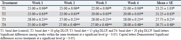 Table 2. Effect of graded DLCP levels on egg production (%) of spent laying hens over 4 weeks.