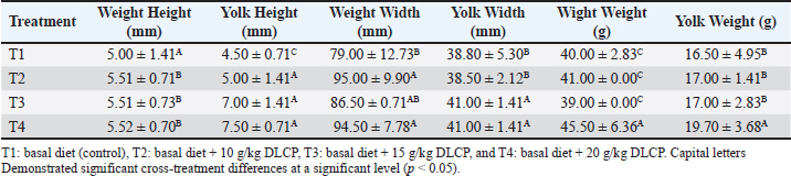 Internal egg qualityAccording to Table 5, all internal quality characteristics, including yolk height, yolk width, yolk index, and yolk weight, were significantly (p < 0.05) increased in T4 treatment. T3 presented intermediate enhancement, especially in yolk height and width, while T1 and T2 remained the lowest values of internal quality. These results may also indicate that the addition of DLCP, even at high levels, would increase the egg’s internal quality with a focus on yolk texture and nutritional quality. Table 5. Effect of DLCP levels on internal egg quality parameters.