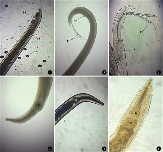 Fig. 1. (1-2) H. gallinarum: tail end of an adult male worm showing large unequal spicules; small (SS) and long spicule (LS), protruding circular precloacal sucker (PS), and anterior region with single esophageal bulb (B). (3-4) H. isolonche: tail end of male worm showing long and equal spicules (ES), preanal protruding sucker (PS), and anterior region with single esophageal bulb (B). (5-6) S. brumpti: tail end of male worm showing equal spicules (ES), preanal slit-like precloacal sucker with muscular striation (S), and anterior region with double esophageal bulb (B). Table 1. Prevalence of parasite species and infection categories in backyard chickens.