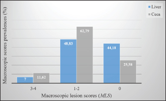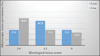Fig. 2. Prevalence of macroscopic lesions in the liver and ceca of the chickens studied.