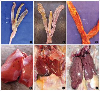 Fig. 3. (1, 3, and 5) Different degrees of MLS in affected ceca showing thickened intestinal walls (WT), hemorrhage (HG), ulceration (UL), and necrotic caseous material (NC). (2, 4, and 6) Different degrees of macroscopic lesions in the liver of affected chickens showing few to numerous small necrotic foci (arrowhead). Histopathological examination of the liver and ceca revealed a distribution consistent with the gross findings: 27.90% (12/43) of livers presented severe lesions (HLS=3-4), 44.18% (19/43) displayed mild to moderate lesions (HLS=1-2), and no histological changes were observed in 27.90% (12/43) of livers (HLS=0) (Fig. 4). Regardless of severity, H. meleagridis trophozoites, ranging from a few to numerous, were detected in hepatic tissue, mainly within fibrotic zones (Fig. 5: 1), exhibiting a dark central nucleus both extracellularly and within histiocytes. The histological sections of the liver show a periportal mononuclear infiltrate, extensive parenchymal necrosis, and steatosis (Fig. 5:3). Histological lesions of ceca were generally more prevalent and severe. Histomonas meleagridis trophozoites were frequently identified in association with damaged mucosa and submucosa (Fig. 5: 2). Severe lesions (HLS=3-4) were recorded in 21/43 (48.83%) samples, characterized by marked mucosal erosion, inflammatory cell infiltration, and abundant necrotic debris (Fig. 5:4). Mild-to-moderate lesions (HLS=1-2) were observed in 12/43 (27.90%) of cases, while 10/43 (23.25%) of ceca were histologically normal (HLS=0) (Fig. 4).