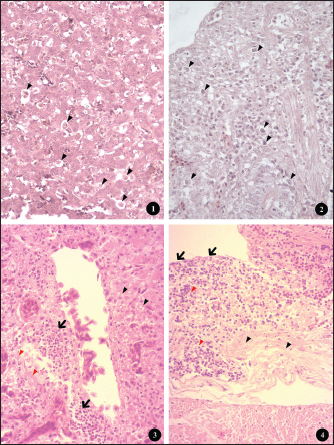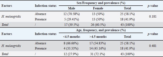 Fig. 5. Histopathological changes in livers and ceca of backyard chickens infected with histomoniasis. (1) Numerous histomonads (arrowhead) in the liver (HE, ×400). (2) Numerous histomonads (arrowhead) in ceca (HE, ×400). (3) Histological section of the liver showing periportal mononuclear infiltrate (black arrow), extensive parenchymal necrosis (red arrowhead), and steatosis (black arrowhead); (HE, ×400). (4) Histological section of ceca with large mucosal erosion (black arrow), extensive mononuclear infiltration (red arrowhead), and necrotic and fibrinous enteritis (black arrowhead); (HE, ×400). Pearson’s chi-square test showed a significant difference among the parasite species (p=0.018) and among the three infection categories: nematode infection, H. meleagridis coinfection with H. gallinarum, and overall parasitism prevalence (p=0.000) (Table 1). Table 2 shows the sex- and age-related distributions. The prevalence of H. meleagridis infection in male and female chickens was 5/17 (29.41%) and 13/26 (50%), respectively, with no significant difference between the two sexes (p=0.181). Additionally, there was no significant difference in prevalence between different age groups (p=0.481), with 45.16% (14/31) adult chickens and 33.33% (4/12) subadult chickens. Table 2. Influence of sex and age factors on the prevalence of H. meleagridis infection.