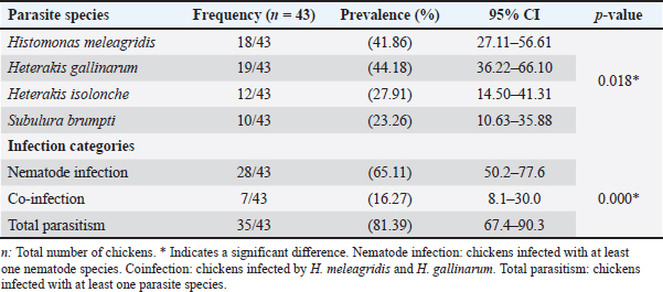 Fig. 4. Prevalence of histological lesions in the liver and ceca of the studied chickens. Regarding lesion severity, the samples without H. meleagridis consistently showed lower mean ranks in both organs (Table 3). For MLS, the mean rank in the liver was 18.56 in samples without H. meleagridis compared to 26.78 in infected samples (p=0.021). A similar trend was observed in the ceca, with the mean ranks increasing from 17.80 (absence) to 27.83 (presence) (p=0.007). A comparable pattern was observed for HLS. In the liver, the mean ranks were 16.30 in the absence of H. meleagridis and 29.92 when the parasite was present, indicating a highly significant difference (p=0.001). In the ceca, the mean rank increased from 17.66 (absence) to 28.03 (presence) (p=0.006). In contrast, H. gallinarum infection did not significantly affect either the macroscopic or HLS in the examined organs (p > 0.05). The mean ranks of the infected and non-infected groups were similar, indicating that H. gallinarum had no significant pathological impact (Table 3). DiscussionIn this study, we report the first histological detection of H. meleagridis in backyard chickens in the Batna province. The findings demonstrate that histomoniasis, which has been widely reported in several countries, also exists in backyard poultry farms in this region of Eastern Algeria and could pose an emerging risk to the national poultry sector. A high prevalence of intestinal parasitism was also observed in the study population, highlighting the importance of enteric infections in traditional poultry systems. This result is comparable to those reported in Morocco (Hassouni and Belghyti, 2006), Colombia (Vergara et al., 2021), and Gabon (Makouloutou-Nzassi et al., 2024). In contrast, lower rates were reported in the Kashmir Valley (Salam et al., 2018) and in the district of Odisha (Hembram et al., 2015). These inter-country variations may reflect differences in climate, management practices, flock health, and preventive measures. In our setting, the high prevalence can be explained by the lack of prophylaxis, close contact with other animal species, and poor hygiene conditions typical of backyard systems. Although free-range poultry farming supports animal welfare, it also increases exposure to diverse pathogens (Jeni et al., 2021). This is consistent with our finding that 65.11% of chickens carried at least one nematode species, highlighting gastrointestinal helminths as a major health issue in backyard flocks. Among the identified parasites, H. gallinarum showed the highest prevalence, followed by H. meleagridis, H. isolonche, and S. brumpti. Although less frequent, the presence of H. isolonche and S. brumpti demonstrates notable parasite diversity and reflects the considerable environmental contamination. However, the high occurrence of H. gallinarum is of particular concern because it is a biological vector of H. meleagridis, the causative agent of histomoniasis, a serious and often fatal disease in turkeys (de Jesus Ramires et al., 2025). The concomitant detection of H. gallinarum and H. meleagridis occurred in only 16.27% of cases, which contrasts with the widely reported synergy between the protozoan and the nematode (Eduardo et al., 2025). Comparable discrepancies have been documented internationally. In Nigeria, H. gallinarum and H. meleagridis were detected in only 14.7% and 10.3% of chickens, respectively, with coinfections accounting for 3.1% of cases (Oriaku et al., 2024). In contrast, Xu et al. (2018) reported a significantly higher prevalence of histomoniasis (94.6%) and a co-infection rate of 50.8% in China. Therefore, the relatively low co-infection rate observed in our study indicates that H. meleagridis could circulate independently of H. gallinarum under local conditions. Alternative transmission routes include direct bird-to-bird transmission via cloacal drinking and reverse peristalsis, insect ingestion, or human-mediated spread (Clarke et al., 2017). Several experimental and clinical studies have demonstrated that cecal infestation by H. meleagridis can reduce the establishment and development of H. gallinarum. Daş et al. (2021) suggested that the absence of a linear relationship between the number of histomonads and H. gallinarum might be explained by the pathological changes induced by histomonads in the cecal environment, which is the habitat of H. gallinarum. Similarly, Schwarz et al. (2011) reported that the inflammatory and destructive lesions of the cecal mucosa observed during H. meleagridis infections can alter the tissue and immune environment, thereby limiting the normal development of H. gallinarum. These mechanisms could explain the low rate of coinfection between the two parasites in our study. Considering the sex and age parameters, although females and adult chickens were more parasitized than males and subadult chickens, no statistically significant difference was found in the infection rate between the two sexes and age categories. This finding aligns with several experimental studies that also reported no statistical difference in infection levels between the age and sex of turkeys inoculated with H. meleagridis (Liebhart et al., 2008). The relatively small size of our sample, limited to 43 chickens (26 females and 17 males, including 12 young and 31 adults), constitutes a limitation to the interpretation of our results. Future work, including a larger sample that considers these variables, would be necessary to confirm or refute the actual impact of these factors on infection. The lesion patterns were consistent with previous histomoniasis descriptions in gallinaceous birds (De Araújo et al., 2015; Hess et al., 2015). Cecal enlargement with wall thickening, severe typhlitis with fibrinous content, and foci of necrosis in the liver were the main macroscopic changes. Simultaneously, histological examination of tissues from both organs confirmed the presence of H. meleagridis trophozoites. Lesion evalu