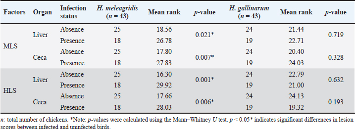 Pathological studyA total of 86 organ samples (43 liver and 43 ceca) from 43 chickens were examined to evaluate the association between H. meleagridis infection and lesion severity. Lesions were scored macroscopically (MLS) and histologically (HLS), and comparisons were made between infected and non-infected birds (Table 3). Table 3. Influence of H. meleagridis and H. gallinarum infection on macroscopic and HLS.