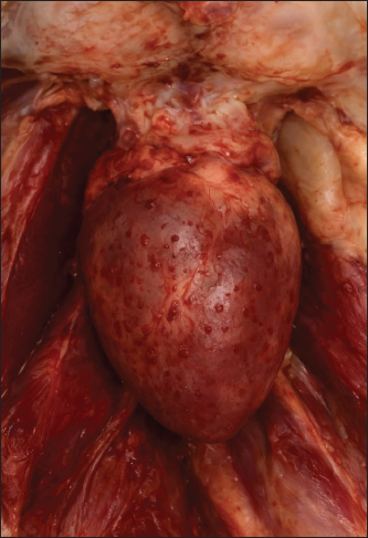 Fig. 2. The pericardium and myocardial petechiae are thickened.