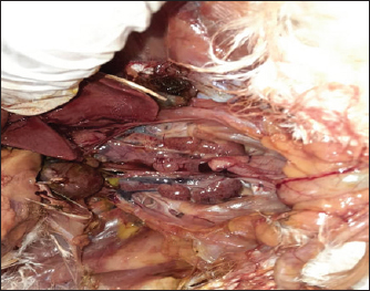 Fig. 4. Enlarged kidneys with marked congestion and swelling. Hematological and biochemical findingsTen affected birds were examined.The findings (Table 1) included anemia, leukocytosis, metabolic acidosis, hyperchloremia, elevated liver enzymes, and renal impairment—consistent with ammonium-induced toxicity (Shahid et al., 2019; Ahmad et al., 2021). Table 1. Hematological and biochemical alterations in poultry ammonium chloride toxicity.