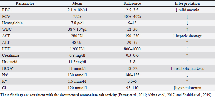 TreatmentThe flock received 10 g/l sodium bicarbonate for 24 hours followed by 5 g/l sodium bicarbonate for 2 days. The supportive therapy included multivitamins and oxytetracycline. Sodium bicarbonate corrects metabolic acidosis by restoring bicarbonate levels (Farrag et al., 2015; Ahmad et al., 2021). Mortality decreased from 56 on day 5 to 4 the following day and ceased within 72 hours. DiscussionAmmonium chloride intoxication involves metabolic acidosis, (Saleh et al., 2020) hepatic congestion, renal enlargement, and muscular damage—findings supported by previous reports (Farrag et al., 2015; Abbas et al., 2017; Ahmad et al., 2021). The presentation may mimic infectious diseases such as Newcastle disease or avian influenza (Alexander, 2001; Saif et al., 2008), but such conditions were excluded due to the lack of characteristic lesions. The biochemical profile in this case matches previously described toxic changes, including electrolyte imbalance and elevated liver and kidney markers (Khan et al., 2014; and Shahid et al., 2019; Ahmad et al., 2021). The rapid response to sodium bicarbonate supports a metabolic origin rather than an infectious etiology. The absence of toxicological quantification is a limitation, a common issue in field cases (Al-Mayah and Al-Mayah, 2018). Future investigations should include confirmation of toxicology assays. ConclusionExcessive administration of ammonium chloride can cause severe metabolic acidosis and multi-organ pathology in poultry. Veterinary supervision and accurate dosing are essential for preventing toxicity and economic losses. Authors' contributionsAll authors contributed equally to this study. Conflict of interestThe authors declare that there is no conflict of interest. Data availabilityAll data were provided in the manuscript. ReferencesAbbas, R.Z., Khan, A., Liu, P. and Saleemi, M.K. 2017. Hematological and biochemical alterations induced by toxicants in poultry. World’s. Poultry. Sci. J. 73(2), 353–364. Ahmad, M.E., Smith, J.D., Brown, A.R. and Lee, S.K. 2021. Electrolyte and acid-base balance in poultry under different pathological conditions. J. Poultry Sci. 100(7), 101–125. Alexander, D.J. 2001. Newcastle disease. Br. Poultry Sci. 42(1), 5–22. Al-Mayah, A.A. and Al-Mayah, H.M. 2018. Biochemical markers of liver and muscle damage in intoxicated chickens. Iraqi. J. Vet. Sci. 32(1), 45–51. Chang, C.F., Chang, T.C. and Chang, S.S. 2010. Ammonium chloride intoxication in animals. Vet. Clin. Pathol. 39(1), 15–20. Farrag, F., Saleh, H.A., Mahmoud, A.M. and Youssef, S.A. 2015. Electrolyte changes and acid–base imbalance in chickens exposed to ammonium salts. Vet. Res. Forum. 6(3), 223–229. Fudge, A.M. 2000. Laboratory medicine: avian and exotic pets. Philadelphia, PA: WB Saunders. WB Saunders. Khan, M.Z., Hussain, I., Ali, S., Ahmed, R. and Saleemi, M.K. 2014. Hematobiochemical changes in toxicity. Pak. Vet. J. 34(3), 331–335. Olanrewaju, H.A., Thaxton, J.P., Dozier, W.A., Purswell, J.L., Roush, W.B. and Branton, S.L. 2007. A review of ammonia toxicity and its effects on poultry production. Poultry Sci. 86(6), 1141–1152. Saif , Y.M., Fadly, A.M., Glisson, J.R., McDougald, L.R., Nolan, L.K. and Swayne, D.E. 2008. Diseases of poultry. Saleh , A.A., El-Sayed, M., Hassan, R. and Mahmoud, F. 2020. Pathophysiological responses to ammonium chloride. J. Appl. Anim. Res. 48(1), 190–198. Shahid, R., Khan, A., Hussain, I., Malik, F. and Ahmed, M.U. 2019. Renal tests in broilers exposed to toxic agents. J. Vet. Diagnostic Invest. 31(5), 688–695.Abbas, R. Z., Khan, A., Liu, P. and Saleemi,M.K. 2017 Hematological and biochemical alterations induced by toxicants in poultry World’s Poultry Science Journal,73(2), pp.353–364. | ||
