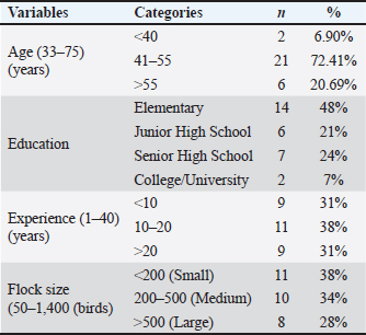 where p represents the probability of a farmer exhibiting a high level of AWK or AWP. Regression coefficients (β) describe the direction and strength of associations, whereas odds ratios (OR=e^β) indicate the change in likelihood associated with a one-unit increase in each predictor. To evaluate the discriminatory performance of significant predictors, the receiver operating characteristic (ROC) curve analysis was conducted. The AUC was interpreted using conventional thresholds: <0.6=poor, 0.6–0.7=fair, 0.7–0.8=moderate, and >0.8=good discrimination (Çorbacıoğlu and Aksel, 2023). A significance level of p < 0.05 was applied throughout the study. Ethical approvalThis study was reviewed and approved by the Humanities Research Ethics Committee, the Ethics Committee on Social Studies and Humanities, and the National Research and Innovation Agency on July 4, 2023, with approval number 450/KE.01/SK/07/2023. All procedures complied with the principles of the Declaration of Helsinki and the COPE guidelines for human participants. Participation was voluntary, and informed consent was obtained before data collection. The respondents were assured of anonymity and confidentiality, and the data were used solely for research. ResultsCharacteristics of the duck farmersThe characteristics of duck farmers in Bekasi (Table 1) revealed that most were in the productive age group of 41–55 years (72.41%), with a predominance of low educational attainment, as nearly half (48%) had only completed elementary school, and only 7% had college or university education. Farming experience was relatively balanced, with the largest proportion having 10–20 years of experience (38%), while flock sizes varied, though small to medium operations (<200–500 birds) were more common (72%) compared to large flocks (>500 birds, 28%). Table 1. Characteristics of Bekasi duck farmers (n=29).