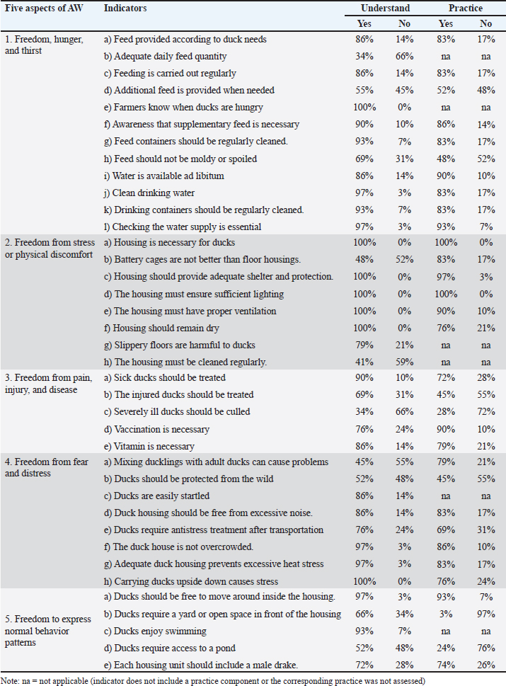Knowledge and practices of farmers on AWTable 2 presents the assessment of farmers’ knowledge and practices related to AW based on the five freedoms. Farmers’ AWK is generally high across most indicators, especially those related to feed and water provision (86%–100%) and housing conditions such as ventilation and cleanliness (≥90%). However, AW implementation is generally inconsistent. For example, only 48% of farmers routinely clean feed containers, and 52% ensure adequate daily feed quantities. Knowledge about stress management and behavioral needs is also uneven, with lower levels of awareness about the importance of providing yards (66%), pools (52%), or avoiding overcrowding (97% knowledge but only 86% practice). Table 2. Assessing farmers’ AWK, and AWP across five aspects.