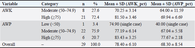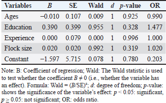 Results on AWKLogistic regression analysis showed that farmer characteristics did not significantly influence the level of AWK. Variables such as age (p=0.225), education (p=0.978), experience (p=0.318), and flock size (p=0.786) were all non-significant, indicating that duck farmers’ AWK was relatively similar regardless of demographic or farm-scale differences (Table 3). Table 3. Distribution and mean scores of AWK, and AWP levels among duck farmers (n=29).