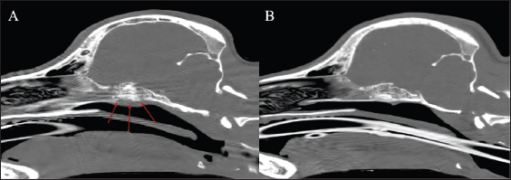 Fig. 1. Bone window (A) pre-treatment sagittal reconstruction and (B) post-treatment sagittal reconstruction of the head, revealing the osteolytic and osteoproliferative lesions (arrows) affecting the sphenoid bone and its resolution after treatment.