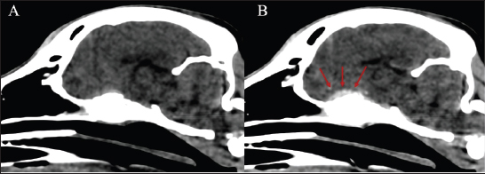 Fig. 2. Soft tissue window sagittal reconstruction of the head (A) pre-contrast and (B) post-contrast administration, showing the contrast-enhancing extra-axial lesion affecting the sphenoid bone (red arrows). Lateral thoracic and lumbar radiographs were performed to localize any additional osteolytic foci due to the multifocal hyperesthesia. Polyostotic radiolucent moth-eaten lesions were observed at the L1, L2, and L3 dorsal processes (Fig. 3). Subsequently, an abdominal ultrasound was performed, showing heterogeneous echogenicity of the spleen and liver parenchyma and enlarged iliac lymphatic nodules. Fine needle aspirates were obtained from the vertebral lesions, spleen, and liver. The cytological evaluation of the bone lytic lesions revealed a mixed inflammatory cellular population predominantly composed of macrophages, plasma cells, lymphocytes, and non-degenerated neutrophils. Intracytoplasmic structures compatible with parasitic forms of Leishmania spp. (amastigotes) were observed inside macrophages (Fig. 4). The same structures were observed in the spleen and liver, along with extramedular hematopoiesis. Based on the previous results, a proteinogram revealed monoclonal gammopathy. An Enzyme-Linked Immunosorbent Assay anti-body anti-leishmania serology resulted in a high seropositive result, 4.93 (R.R: 0–0.9).