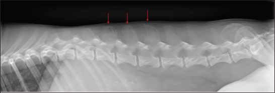 Fig. 3. Laterolateral radiograph of the caudal thoracic and lumbar spine. Polyostotic radiolucent moth-eaten lesions were visible in the dorsal processes of L1, L2, and L3 (red arrows).