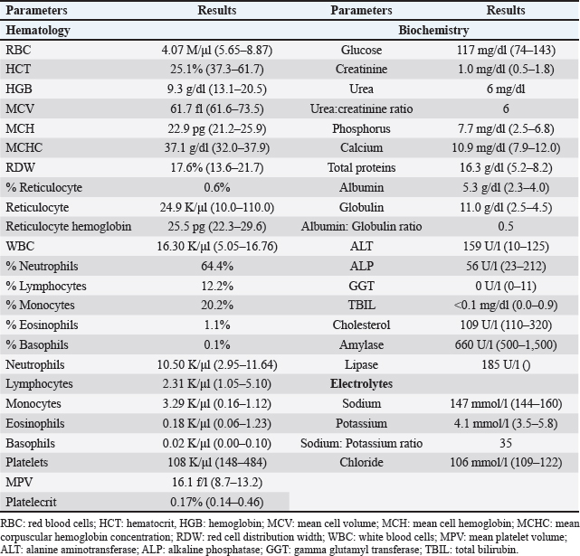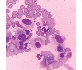 Fig. 4. Smear cytology of the vertebral lesion (hematoxylin and eosin staining). Note the presence of intracytoplasmic amastigotes (arrowheads) inside the macrophages. The dog was treated with a 4-week course of 100 mg/kg meglumine antimoniate (Antishmania, Fatro ibérica, Barcelona, Spain) subcutaneously once daily and 10 mg/kg alopurinol (Alopurinol Normon, Normon, Madrid, Spain) orally twice daily. In addition, prednisone (Prednisona Cinfa, Cinfa, Huarte, Spain) at 0.5 mg/kg twice daily orally was administered for 7 days to treat the possible vasogenic edema secondary to the inflammatory response produced by the intracranial lesion. No side effects were witnessed by the owner, and the dog tolerated the treatment well. Two and a half months after diagnosis, the dog was presented for a recheck. The physical and neurological examinations did not reveal any abnormalities. Additionally, the dog was reported to be clinically normal. A follow-up head CT scan with intravenous contrast was performed to evaluate the progression of the sphenoid bone lesions (Fig. 1). The previously described osteolytic and osteoproliferative lesions had healed, and the extra-axial mass lesion had resolved. Simultaneously, a follow-up proteinogram showed an improvement in the monoclonal gammopathy. During a telephone consultation 5 months after diagnosis, the owner reported that the dog was clinically normal and had an excellent quality of life. At that time, the dog was still receiving alopurinol, and the treatment was monitored by the referring veterinarian. Additional serological evaluations were declined due to financial constraints. DiscussionTo the best of the authors’ knowledge, this is the first case report that describes the CT findings and their resolution after 2 months of treatment in a dog with MCFS presumptively secondary to Leishmania spp. infection. Canine leishmaniasis has been reported to have the ability to infect multiple organs, including the nervous and musculoskeletal systems (Giannuzzi et al., 2017; Silva et al., 2022). Although nervous system involvement is considered rare in cases of canine leishmaniasis, the reported pathologies include vasculitis affecting the spinal cord and choroid plexi, myositis, intramedullary and extradural granulomas, granulomatous radiculoneuritis, meningomyelitis, meningoencephalitis, granulomatous meningitis, cerebral ischemic and hemorrhagic infarcts, ischemic myelopathy and compressive myelopathy (Pumarola et al., 1991; Vamvakidis et al., 2000; Viñuelas et al., 2001; Font et al., 2004; Ikeda et al., 2007; Paciello et al., 2009; Cauduro et al., 2011; José-López et al., 2012; José-López et al., 2014; Giannuzzi et al., 2017; Marquez et al., 2013; Farré Mariné et al., 2019). Regarding the musculoskeletal system, the ability of Leishmania spp. to produce myositis and osteolytic lesions, especially of joints, has been previously reported in the literature (Silva et al., 2021; Silva et al., 2022). Similar to the osseous changes seen in our case, the characteristic radiographic findings secondary to Leishmania spp. include a combination of periosteal reaction, intramedullary opacity alterations, and cortical or medullary structure destruction (Safrany et al., 2023). A previous case report published in 2023 described a dog presented with acute blindness presumptively secondary to bilateral optic neuritis and sphenoid bone osteomyelitis due to leishmaniosis diagnosed with serology. On neurological examination, the dog showed an absent menace response and bilaterally absent direct and indirect pupillary light reflexes. However, because the vestibulo-ocular reflexes were described as normal, a middle cranial fossa syndrome was not considered. The CT scan revealed similar findings to our case in the sphenoid bone, but a follow-up CT proving resolution of bony lesions was not performed despite the dog responding well to treatment. Furthermore, no further clinicopathological and serological monitoring was performed after treatment. In contrast with our case, the presence of amastigotes was not observed (Safrany et al., 2023). Neoplasia is the most frequent condition in dogs with neurological deficits causing MCFS (Jones et al., 2018). Reported tumours affecting the sphenoid bone include meningioma, lymphoma, thyroid adenocarcinoma, melanoma, neuroendocrine carcinoma, primitive neuroectodermic tumor, chondrosarcoma, nerve sheath tumor, and mast cell tumor (Beltran et al., 2010; Rissi, 2015; Jones et al., 2018). Due to the aggressive characteristics of the skull base bone lesions, neoplasia was also considered in this case at the time of diagnosis. Biopsies are regularly taken from the skull base using neurointerventional techniques in human medicine (Wilseck et al., 2021). However, access to the ventral area of the cranial vault for biopsy sampling is considered a high-risk procedure in veterinary medicine (Owen et al., 2018; Chen et al., 2023). Therefore, in this case, samples were not obtained from the sphenoid bone lesions. Nevertheless, considering that the sphenoid bone and lumbar vertebrae lesions shared similar characteristics, the already known ability of Leishmania spp. to produce multifocal invasion of different organs, and the young age of the patient, it was reasonable to assume that the intracranial lesion was also caused by Leishmania spp. A neoplastic process or bacterial osteomyelitis was also considered and could not be completely ruled out. However, the presence of amastigotes in the lumbar vertebrae and the high Leishmania spp. anti-body titer result, in addition to the good clinical response to the treatment and the complete resolution of radiological findings in the control CT made a Leishmania spp. basisphenoid osteomyelitis is the most likely diagnosis. To the best of the authors´ knowledge, there is only one case reported of a dog with appendicular lytic bone lesions diagnosed with leishmaniasis that evaluated the response of CT findings a