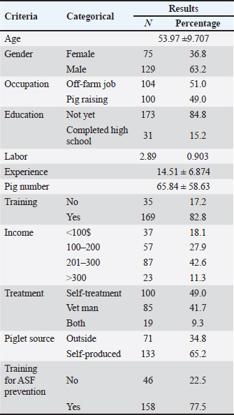 AbstractBackground: African swine fever (ASF) has caused huge losses in the pig farming industry in Vietnam, mainly affecting small-scale pig farmers. Due to the lack of information concerning ASF, farmers cannot prevent it and improve their biosecurity toward ASF disease. Aim: This study aimed to assess the influence of sociodemographic and production characteristics on knowledge toward ASF-related information and ASF prevention practices. Methods: A random sampling method was used to select respondents. Thus, 204 pig farms in Ben Tre province were selected. Data were analyzed using a descriptive method and multiple linear regression analysis. Results: The results showed that most of the farmers were male and joined in farm activities with 1–2 family members who had high experience in pig farming. Farmers had gained knowledge about ASF and applied effective prevention measures on their farms. In addition, primary occupation and piglet source exerted a significant effect on both the knowledge of ASF and the prevention ability. General livestock technical training (non-ASF) showed a negative association with ASF knowledge and prevention practices, whereas ASF-specific training significantly improved farmers’ understanding and implementation of ASF prevention measures. Regarding other factors, income, piglet number, and treatment practices at farms were additionally associated with farmers’ implementation of ASF prevention. Engagement in training on ASF biosecurity measures significantly enhanced the understanding and implementation of ASF prevention practices. Conclusion: Sociodemographic and training factors significantly impact farmers’ disease prevention capabilities, underscoring the need for ASF-targeted training to improve disease prevention in small-scale pig farming. This study recommended that further training strategies focused on ASF prevention practice should be implemented. Keywords: Disease management, Farming practice, Rural area, Information, Transmission. IntroductionPig farming is also known as the most preferred livestock farming in Vietnam and has economic significance to smallholder farmers, especially in rural areas. Up to 80% of the total income of pig farmers is earned from selling pigs mainly produced by small-scale producers (Huong et al., 2023). Currently, African swine fever (ASF) has emerged as a major threat to the pig industry in Vietnam. The first outbreak of ASF, a viral disease, occurred in Vietnam in 2019 and spread rapidly throughout the country (Jeong et al., 2019) . ASF is a highly fatal disease for pigs, and no effective vaccine or treatment exists at the time, making the prevention of the outbreaks challenging. The change in income due to ASF ranged from −0.3 to −0.45% in rural areas, while the live pork market price dropped from US$1.61/kg live weight to 1.39 USD/kg live weight after the first ASF outbreak, along with the increased production costs due to the outbreak, which had severe consequences for farmers’ profits (Nguyen-Thi et al., 2021). Globally, biosecurity is considered the most important measure to avert ASF outbreaks (Alarcón et al., 2021; Klein et al., 2024). In wealthy nations, extensive farms frequently implement stringent biosecurity measures to safeguard pigs against disease introduction (Nielsen et al., 2021). However, applying these measures in small-scale farms is challenging. Veterinarian officers and policy makers have expressed concerns that not all pig farmers are adequately prepared to solve the problem. In addition, pig farmers reported that they did not consider ASF to be a potential threat to their income in the interviews of farmers’ perceptions toward the threat of ASF (Klein et al., 2023). Previous research has found that rural pig farmers in Vietnam lack the financial resources and knowledge to adequately apply disease prevention (Qui et al., 2024b). Furthermore, sociodemographic factors such as education level, farming experience, and access to information also significantly help or hinder farmers’ practice of disease prevention measures (Qui et al., 2024a). Farmers with low incomes, little training, and little information about diseases often find it challenging to implement effective disease prevention measures (Qui et al., 2024a; Qui et al., 2024b). Lack of information may lead to a higher risk of disease spread in rural areas where small-scale livestock farming is predominant (Nga et al., 2021). Previous research on factors influencing farmers’ decisions about animal disease prevention has also shown that risk perception influences farmers’ behavior (Doidge et al., 2021). Some research has also recorded that knowledge and attitudes influence biosecurity and are related to farmers’ biosecurity behavior (O’Kane et al., 2017; Qui et al., 2024a). Social science approaches in veterinary epidemiology are increasingly recognized for their role in explaining the influence of stakeholder behavior on disease prevention and management (Biesheuvel et al., 2021). However, knowledge regarding the causes and impacts of farmers’ biosecurity prevention practices to control and manage animal diseases remains limited (Hidano et al., 2018). Understanding factors affecting farmers’ knowledge and ASF disease prevention practices becomes increasingly important, as ASF continues to severely threaten the pig industry of Vietnam, especially small-scale farms. This study aimed to ascertain how social and production factors of pig farmers affect the practice of ASF prevention measures in small-scale farms. It will provide an overview of the difficulties faced by farmers to elaborate on more effective support policies and training programs. Materials and MethodsResearch locationThis study was conducted from January to March 2025 in Ben Tre Province, Vietnam. Ben Tre has a long pig farming tradition, which is important to the agricultural sector in the Mekong Delta and Vietnam. Ben Tre was chosen as the study 