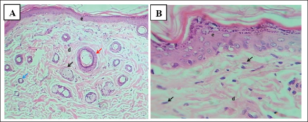 Fig. 6. (A) Section of skin (control group) shows: normal appearance of epidermis lining epithelial cells (e), normal dermal collagen fibers and cells (d), hair follicles (red arrow) with related sebaceous glands (black arrows) and sweat gland duct (blue arrow). H&E stain.100×. (B) Section of skin (control group) shows: normal appearance of epidermis epithelial cells (e), normal dermal collagen fibers (d), and fibroblasts (arrow). H&E stain.400×.