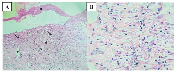 Fig. 8. (A) Section of the skin (treated with 6% gel formulation) shows: thin mature epidermis lining cells, (d) dermis with mature granulation tissue with many figures of angiogenesis, (v) and moderate infiltration of mononuclear leukocytes (arrows). H&E stain.100×. (B) Section of skin (treated with 6% gel formulation) shows: dermis with mature granulation tissue with many figures of angiogenesis and moderate infiltration of mononuclear leukocytes. H&E stain.400×.