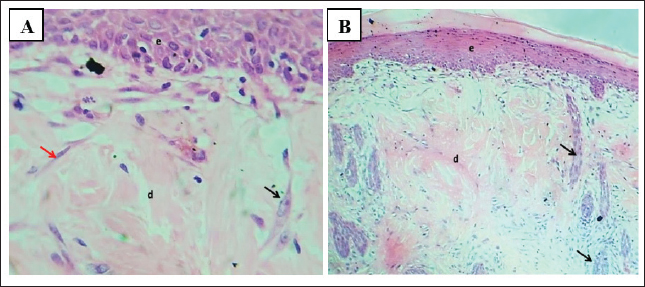 Fig. 9. (A) Section of skin (treatment group with gel 12%) shows: thin mature epidermis lining cells and (d) dermis with normal mature granulation tissue with many figures of hair follicles (arrow). H&E stain.10×. (B) Section of skin (treatment group with gel 12%) shows: thin mature epidermis lining cells and (d) dermis with normal mature fibrous tissue with fibroblasts (black arrow) and fibrocytes (red arrow). H&E stain.400×.