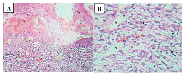 Fig. 10. (A) section of skin treated with fucidin (2%) shows: superficial fibrin clot (black arrows), necrotic tissue with dead leukocytes (n), marked dermis angiogenesis (yellow arrow), and dermis immature granulation tissue with moderated infiltration of mononuclear leukocytes (red arrows). H&E stain.100×. (B) Section of skin dermis (treated with 2% Fucidin) shows marked angiogenesis (Mish work of blood vessels), immature granulation tissue with fibroplasia (red arrows), and moderate infiltration of mononuclear leukocytes (black arrows). H&E stain.400×. DiscussionThe prominent finding of S. aureus within S. aureus within these feline wounds wittilngly correlates with the findings of Wang et al. (2024), who identified S. aureus as one of the most clinically impactful resistance pathogens within skin and soft-tissue infections. This evidence corresponds exactly with the data of with Lenart-Boroń et al. (2024), who bafflingly highlighted the lack of wounds with staphylococci and the etiology of infected skin and soft tissue wounds. Reflecting on the One Health approach, these data gaps correspond with the antimicrobial resistance region that Chinemerem Nwobodo et al. (2022) investigated and reported on the human–animal interface and are similar to the works of Napita et al. (2025), who found numerous antimicrobial resistance gene reservoirs that complicate topical antibiotic treatment. The data from trauma and surgery S. Auri12 portions of our sample are more comparable to the works of Halicioglu et al. (2025) which study staphylococcal infection and delayed closure under conventional care to procedural and traumatic wounds. The overlap between more than eight languages on polyherbal formulation, having a statistically significant decrease of over 12% change in area regression growth rate of sore, is similar to the report of Stefanou et al. 2021 which states that interventions based on pomegranate help in the re-epithelialization of the skin, and collagen defects augment collagen-aligned cutaneous defects. In contrast to the study of Hemmati et al. (2020), the closure of the wound and the histological architecture of the pomegranate-treated group was better than that of the control group. Similarly, the phenolics of rosemary and pumpkin in our formulation are in line with the findings of Karthikeyan and Vidya (2019) who found that rosemary phenolics have antioxidant and skin-protecting properties, and with those of Ouyang et al. (2021) who found that plant matrices linked to ferulic and rutin provide polyphenols beneficial to matrix oxidative stress control and that ferulic- and rutin-linked preparations are helpful for oxidative stress and matrix stabilization. Altogether, the polyphenol literature indicating that the inflamed tissue reworking of the tissues is of a short duration, and the remodeling of tissues is of haste with the polyphenol abundant tapes is what the macroscopic gains to the tissue prove. The biochemical sequence of an initial increase followed by a severe suppression of values for VEGF and TNF-α, while Hyp increased, corresponds to an anticipated biochemical pattern for infected wounds that progress to organized repair. In particular, the VEGF/TNF-α declines align with Chojnacka and Lewandowska (2020), who noted that polyphenols modulate dysregulated angiogenic and inflammatory processes in chronic dermal injuries. It is also consistent with the findings of Tornese et al. (2024), who noted that pomegranate-derived interventions displayed antiangiogenic normalization. The antioxidant-matrix interest is also similar to what Merecz-Sadowska et al. (2021) described, in which flavonoids maintained fibroblast activity and stimulated collagen synthesis during oxidative stress. In addition, the pattern of polyphenol-mediated decrease in inflammatory load relative to collagen content is similar to that reported by Halicioglu et al. (2025) in which pomegranate constituents downregulated pro-inflammatory factors while assisting in tissue repair. Regarding the repair of collagen deposition and re-epithelization concomitantly with S. aureus, there is a restoration of complex function as described by Yokota et al. (2021) regarding the staphylococcal impairment of fibroblast migration and collagen production, which is the deficit that seemed countering by our gel. The histological normalization we observed is also reminiscent of Roy et al. (2020) who showed that biofilm-infected wounds have an inflammatory milieu that is disordered in granulation and deficient in collagen. Thus, our results agree with the idea that in infected wounds, therapy that combines both matrix-centered repair and bacterial suppression is required. Davidova et al. (2024) described this combined need with the tissue-level benefits of polyphenol antimicrobial actions that may relieve the selective pressure of described single-target antibiotics. Staphylococci were nearly exclusive in the current infected wound model, and the strong superiority of a phenolic polyherbal gel over a single-agent antibiotic is in line with several recent University of Baghdad studies, which provide a coherent One Health framework for infection control and tissue repair when taken together. From a veterinary perspective, our culture-first, confirmation-second approach parallels local bacteriological workflows and case mix complexity documented in equine strangles surveillance, where meticulous clinical sampling and laboratory verification were paramount in defining pathogen distributions (Abdul Latif and Yousif, 2025), and aligns with regional transboundary disease surveillance that has successfully isolated and typed high-consequence agents like SAT2 FMDV (Al-Anbagi and Allawe, 2025). The treatment contrast seen here—better closure, suppression of VEGF and TNF-α, and increased collagen—also resonates with formulation studies showing that locally manufactured gels can adequately target and deliver anti-inflammatory agents